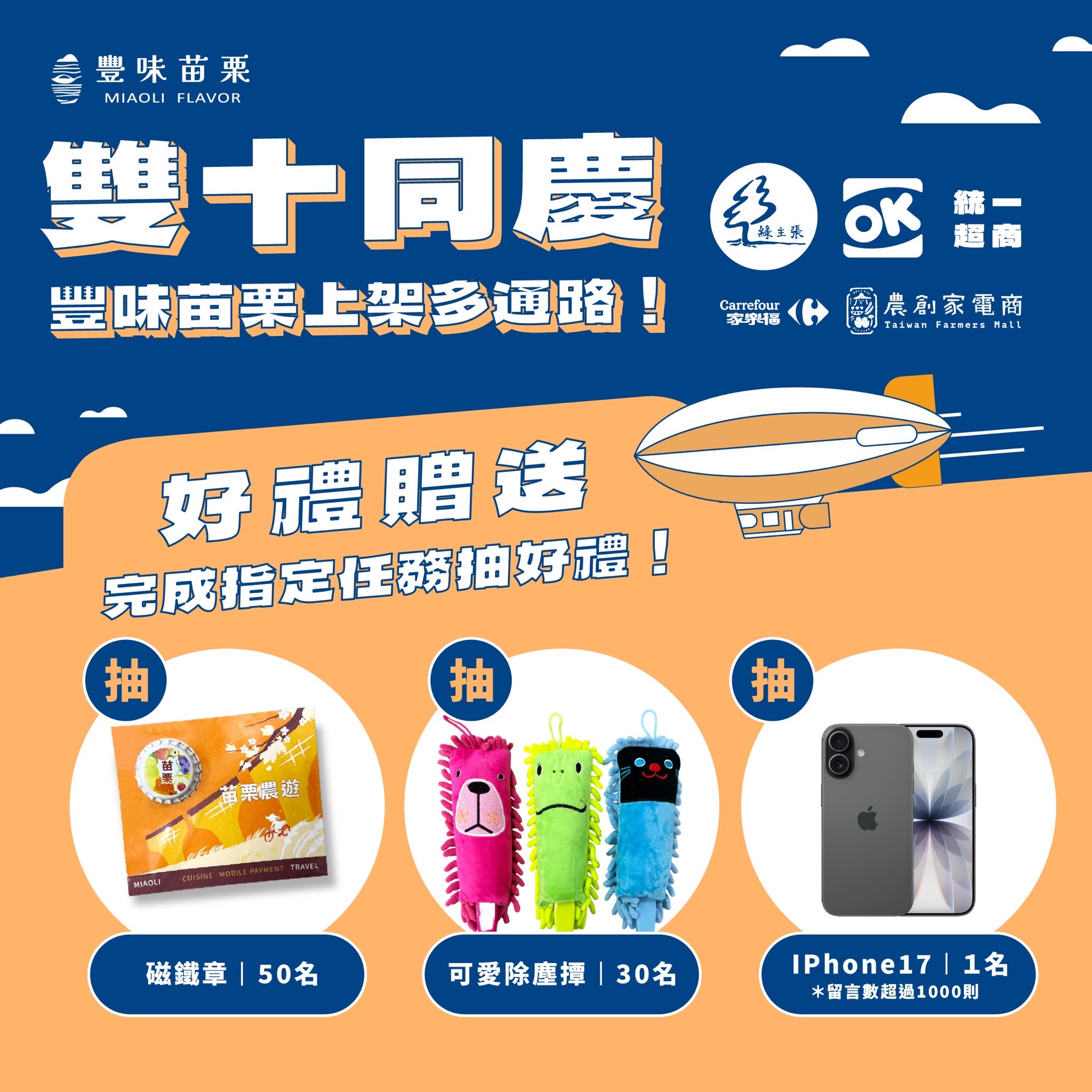 由苗栗縣政府傾力打造的縣級農產品品牌《豐味苗栗》,在「農產品品牌化、行銷通路化」的主軸下,正式宣告通路「五路並進、全台買得到」!目前產品已成功進駐 7-ELEVEN、全家、OK超商三大超商系統,家樂福量販店及各地農會超市系統外,《豐味苗栗》更跨足數位領域,陸續上架「台灣農創」電商平台。縣長鍾東錦表示,這項成果讓苗栗最具代表性的農特產不再受限地域,無論消費者身處何處,都能輕鬆購得,實踐「全民買得到、吃得到、信得過」的目標。 ![]() 苗栗縣長鍾東錦指出,《豐味苗栗》是整合全縣農產資源、推動品牌化的重要成果,更是讓在地小農產品「走出去」的關鍵一步。透過五大通路的拓展,讓消費者在日常購物時,也能成為支持在地農業、實踐永續的行動者,將農產品從產地一路送到全國民眾手中。 雙十限定!線上抽獎最大獎「iPhone」 號召全民挺苗栗為歡慶雙十連假,並慶祝《豐味苗栗》商品擴大上架各通路,品牌特別於「苗栗休閒苗栗趴趴走」臉書線上抽好禮活動,邀請全台民眾一起支持在地品牌,就有機會將最新型號的 iPhone17 帶回家! ![]() ![]() 目前《豐味苗栗》上架的商品豐富多元,包含農村創意商品到地方明星產品,如:苑裡香菇濃湯米乖乖、飛牛牧場乳製系列、公館紅棗、獅潭仙草產品、通霄花生好物等。民眾不僅可至各大通路選購,更別錯過線上的響應活動。 |