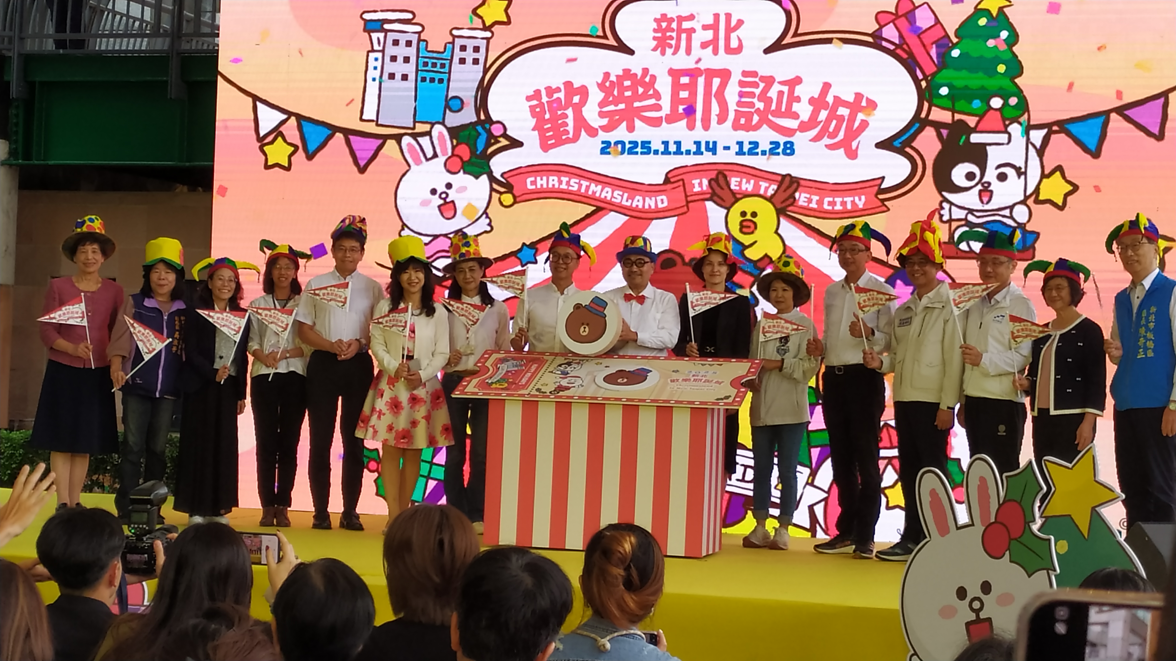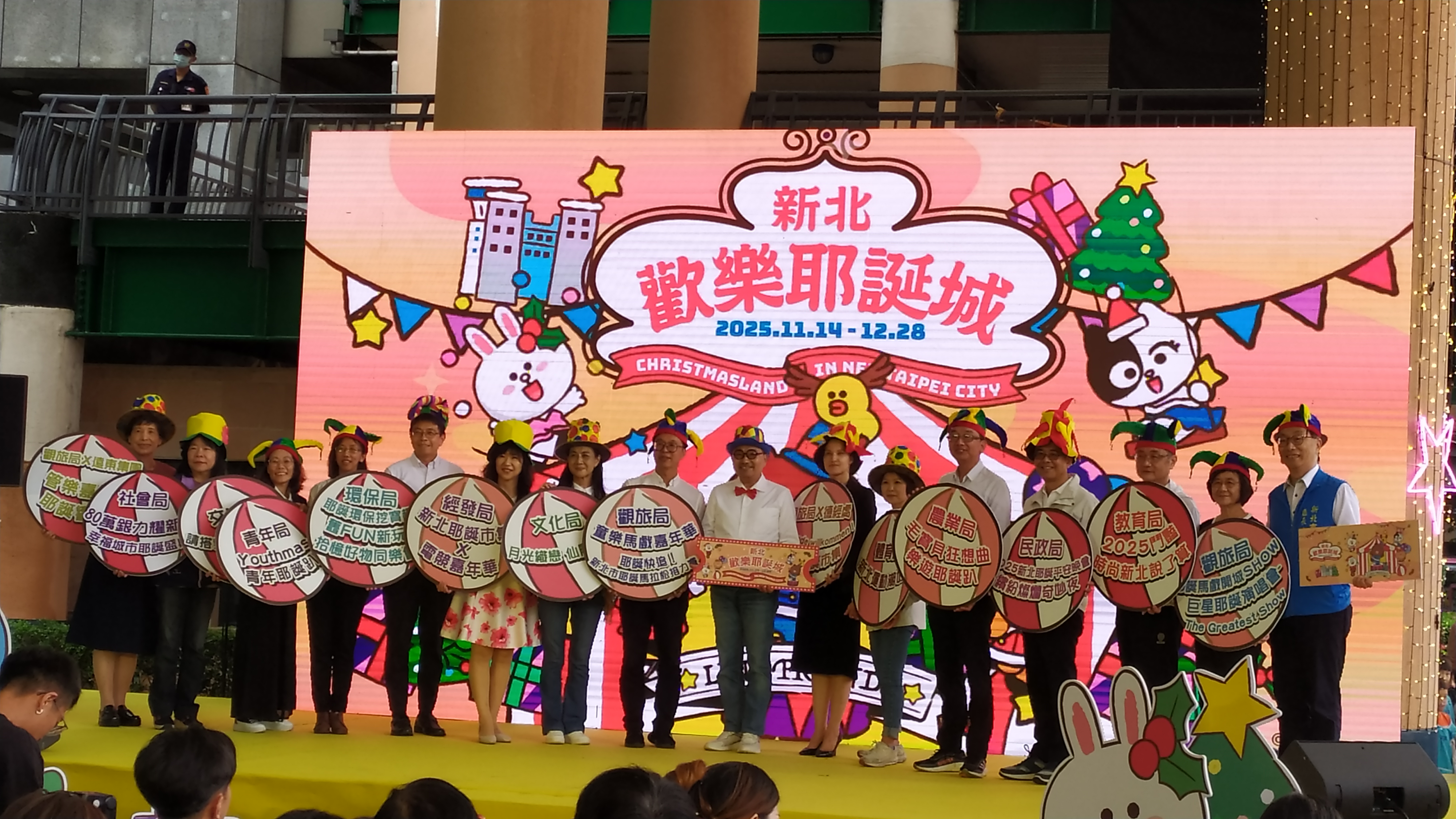 2025新北歡樂耶誕城以「馬戲嘉年華」為主題,與全球知名的「LINE FRIENDS & LINE FRIENDS minini」角色IP品牌合作,打造可愛趣味的各式裝置,將分布在市民廣場、站前廣場、萬坪公園、府中廣場以及板橋轉運站等區域,而10月23日記者會也揭曉活動10大亮點,包含「全臺唯一!夢幻馬戲主燈華麗登場」,主燈以「歡樂馬戲棚」為主題,結合燈光、音樂與動態機械,打造出夢幻的主燈秀、「萬眾矚目!奇幻馬戲大秀震撼開幕」,在開城夜晚將帶來精采絕倫的馬戲大秀、「全新展演!演唱會投影及LED舞臺首度連動」,運用光影隨音樂節奏變幻,創造沉浸式的聲光體驗、「全球知名 IP!LINE FRIENDS & LINE FRIENDS minini新北全燈區總動員」,可愛的LINE FRIENDS熊大、熊美、莎莉、兔兔與minini夥伴們lenini、salini、bnini現身燈區,打造限定版耶誕造景與打卡點、「創新科技!美味探索五感沉浸體驗」,以五感沉浸體驗區為主題,全方位感受科技帶來的趣味與驚喜、「高吸睛度!全新裸視彩幕裝置強勢來襲」,運用大型貨櫃營造裸視3D彩幕技術、立體特效,為耶誕城注入全新視覺魅力、「秒飛國外!全臺最美歐洲童話村」,站前廣場打造成歐洲童話村,讓人彷彿漫步歐洲冬日場景、「多組機械裝置動感展演」,燈光、機械與聲效交織,打造最具體驗感與科技感的耶誕魅力讓你目不暇及、「全面宣傳!7-11廣告行銷遍布全臺」,全臺 7-ELEVEN 店內合作同步展開宣傳,全面行銷 2025 新北歡樂耶誕城資訊,以及「可愛滿載!CHOCO熊美爆米花桶限定販售」,耶誕城推出限限量版「CHOCO熊美爆米花桶」,粉嫩造型萌度破表!