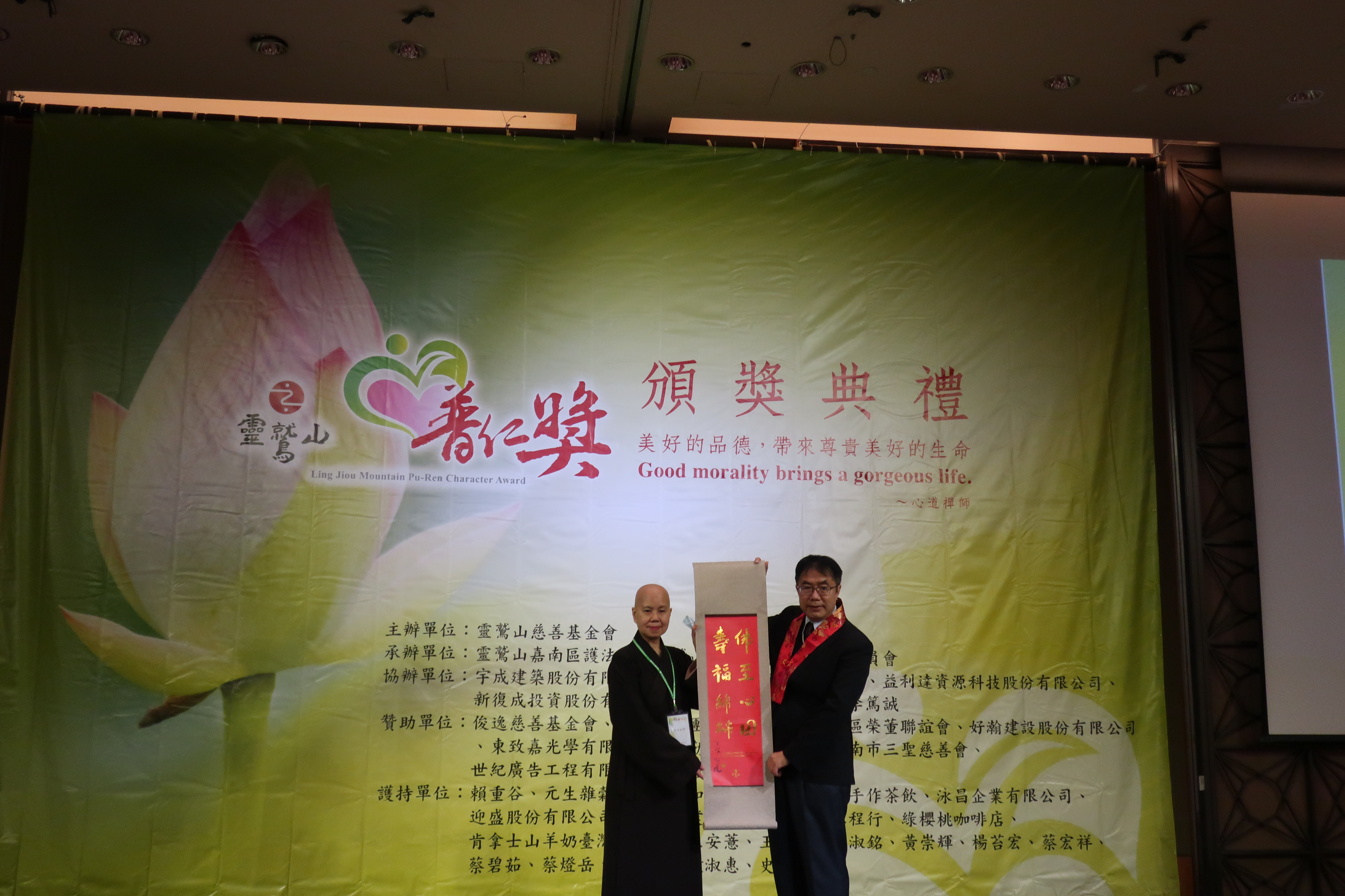 圖說4. 靈鷲山慈善基金會董事長性月法師致贈台南市長黃偉哲心道法師墨寶。(圖片提供/靈鷲山佛教教團)