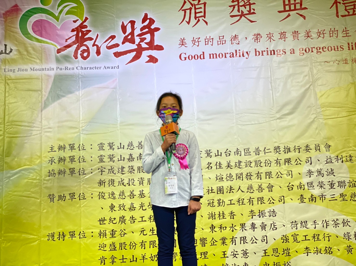 樹人國小6年級的黃旻淇代表小太陽致詞,她感謝心道法師的大愛讓她今天有機會站在台上領獎。勤勞節儉的媽媽來自大陸福建,在蘭花園工作,薪水微薄,不曾為自己添購新衣,可是每當她要參加語文競賽時,媽媽就會為她購置漂亮的衣服,謝謝媽媽的辛苦,將來長大,要照顧媽媽,帶她回故鄉。她也謝謝普仁獎的肯定,現在接受大家的關愛,相信長大後的我們會本著「普仁」為普遍仁慈,「普遍的仁子」之義,本著「人飢己飢,人溺己溺」的精神,幫助弱勢族群,讓社會遍佈胸懷仁心的「仁子」,成為散播愛的希望種子,成為自利利人之社會棟樑。