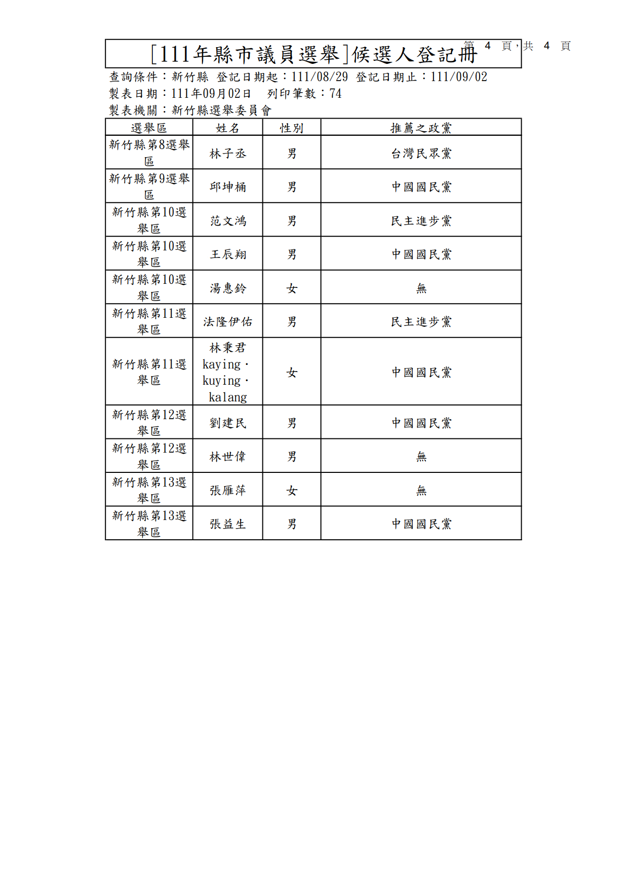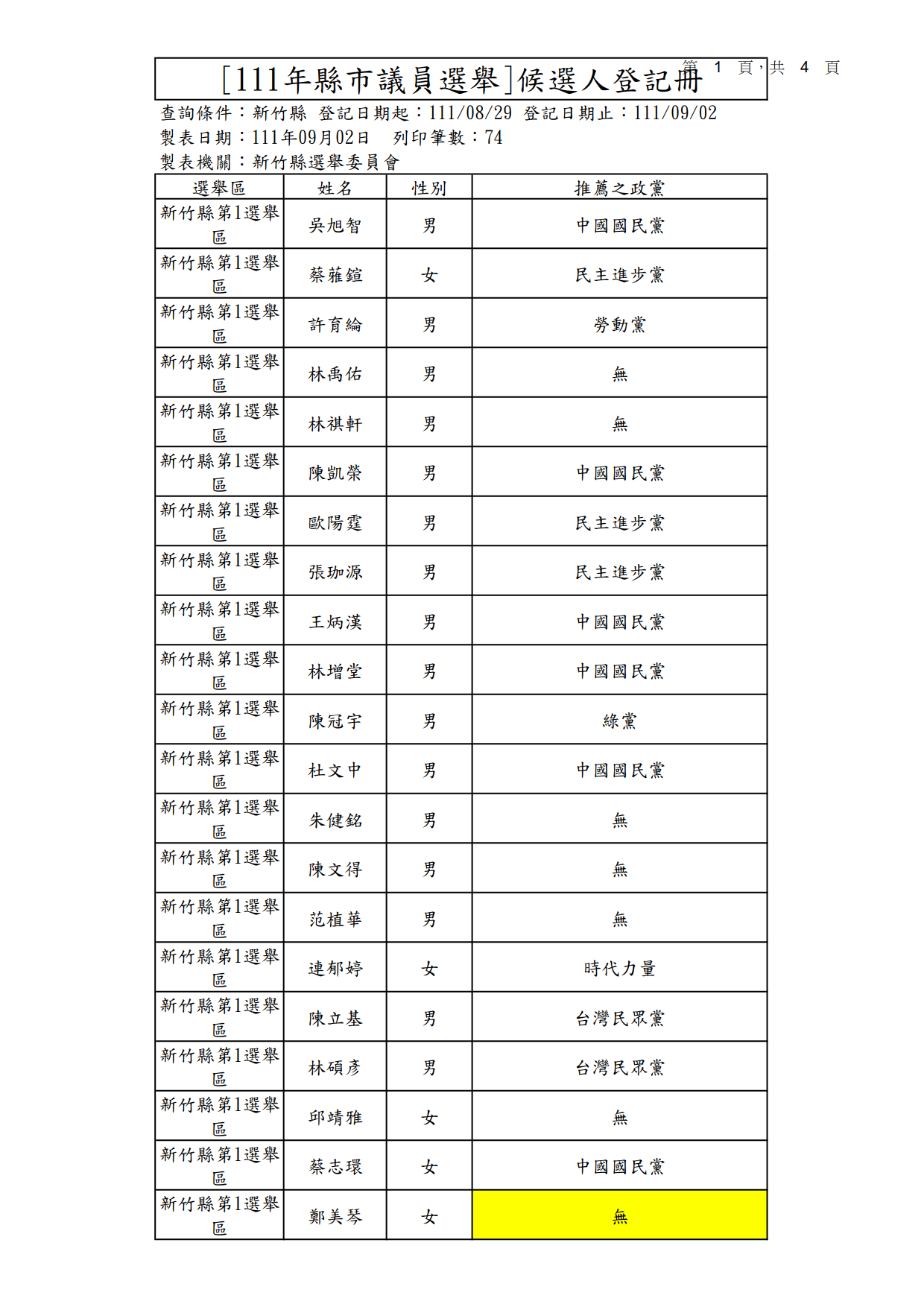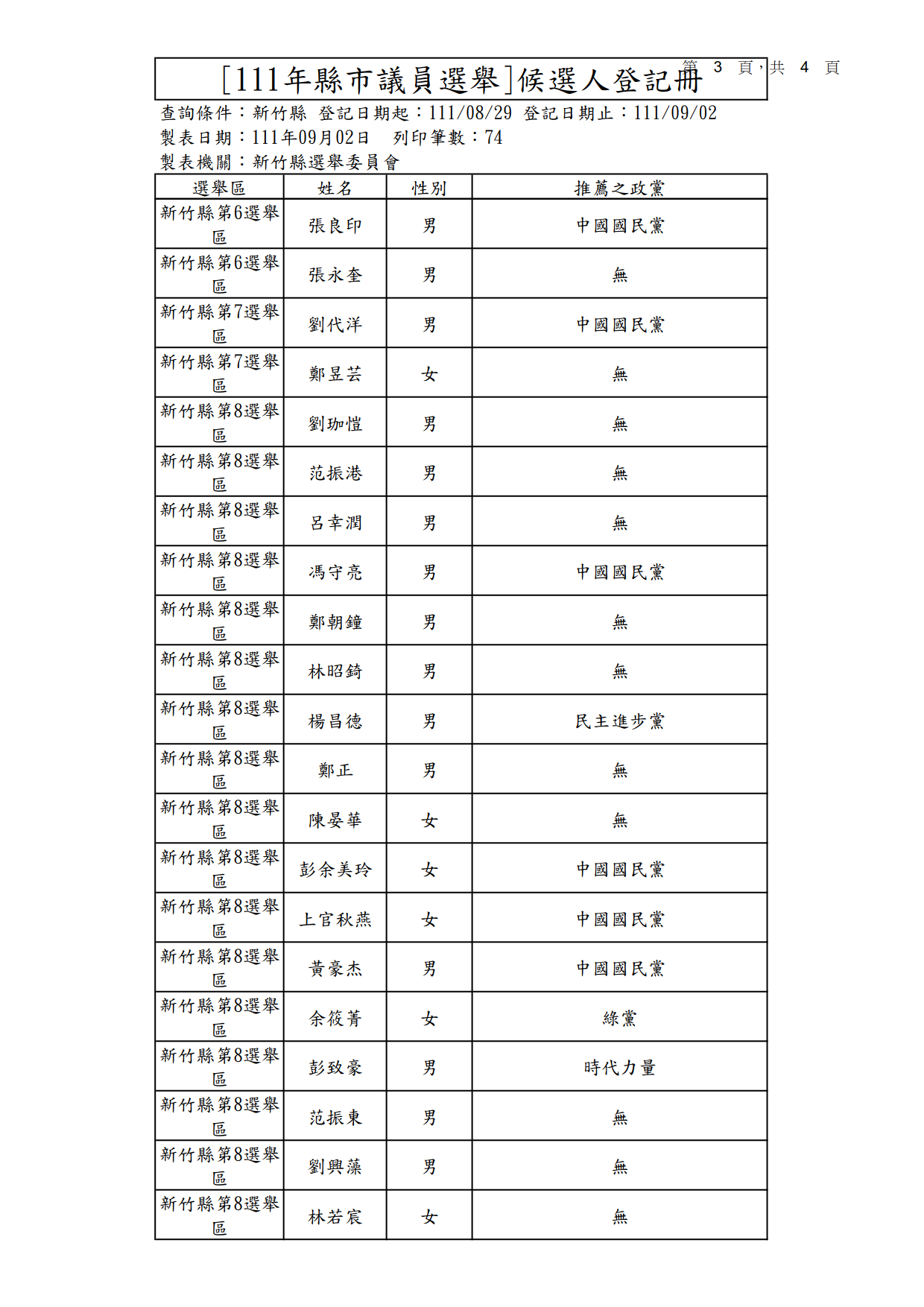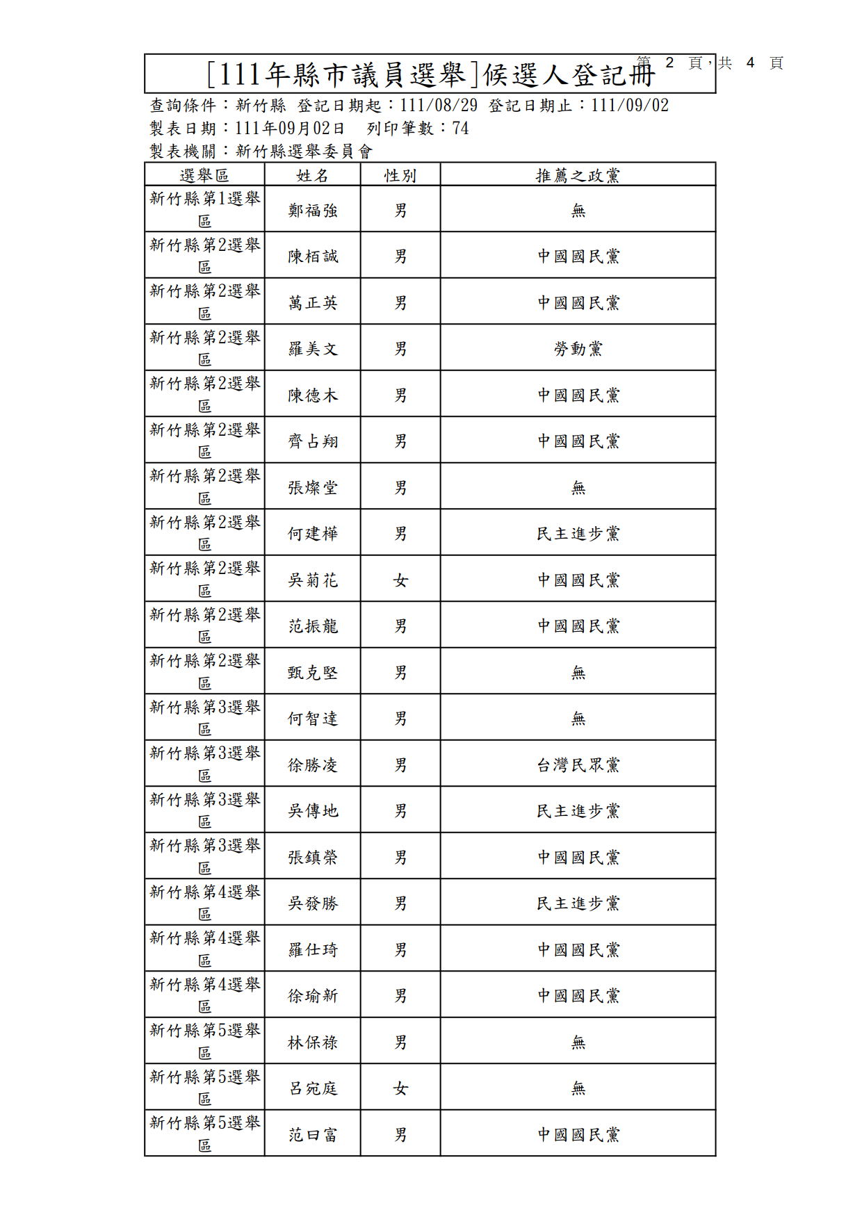 111年九合一選舉今(2日)截止登記,新竹縣長候選人登記部分共有5人登記參選,其餘公職人員候選人登記情形如下。