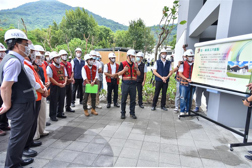 園區這6年有一項非常重要的計畫,「綠珠雕琢再造6年計畫」,目的就是全面提升園區內的軟硬體設施設備,總經費12.114億元,謝謝院長在今年4月核定追加3.471億元,是園區創園營運以來投入最多經費的計畫。目前已完成園區道路及停車場鋪面改善、添購電動及環保節能遊園車8台,復建原住民族傳統建築住家展示屋25棟及附屬設施60間,很重要的,等一下也要邀請院長視察即將完工的民族劇場新建工程。