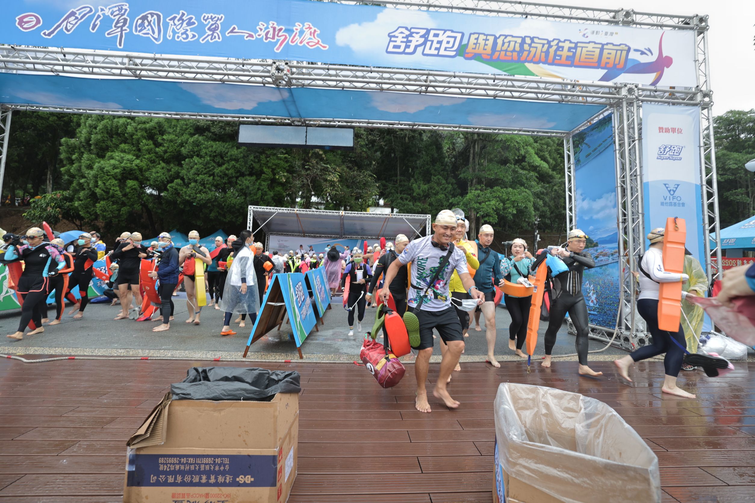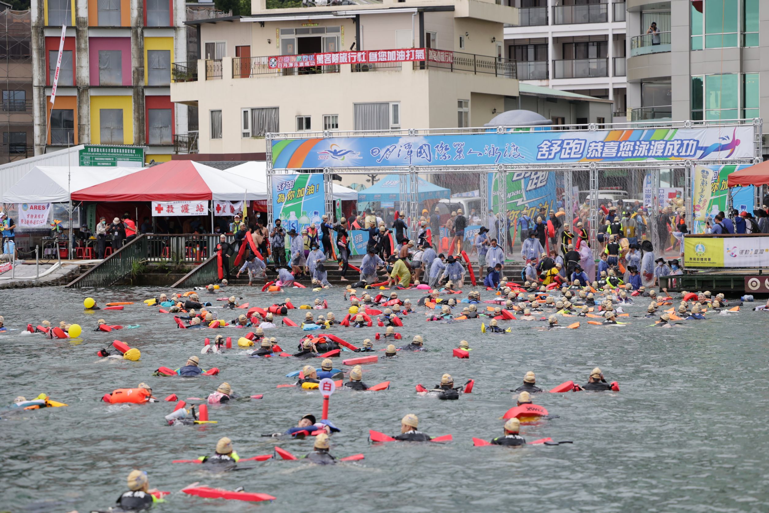 今年邁入第 40 屆的日月潭國際萬人泳渡盛會,克服軒嵐諾颱近逼考驗,在南投縣政府團隊全力以赴做好防疫及安全維護準備下,4日上午冒雨如期舉辦,包括前總統馬英九在內的1萬8千多名報名泳士,有超過9成無畏風雨下水挑戰泳渡日月潭3000公尺長泳,縣長林明溱在活動開幕時特別提醒參加泳士「安全第一、量力而為」,隨著參加泳士陸續上岸,日月潭天氣也跟著轉好,整場活動的滋味對參加泳士及工作人員宛如倒吃甘蔗越來越甜。