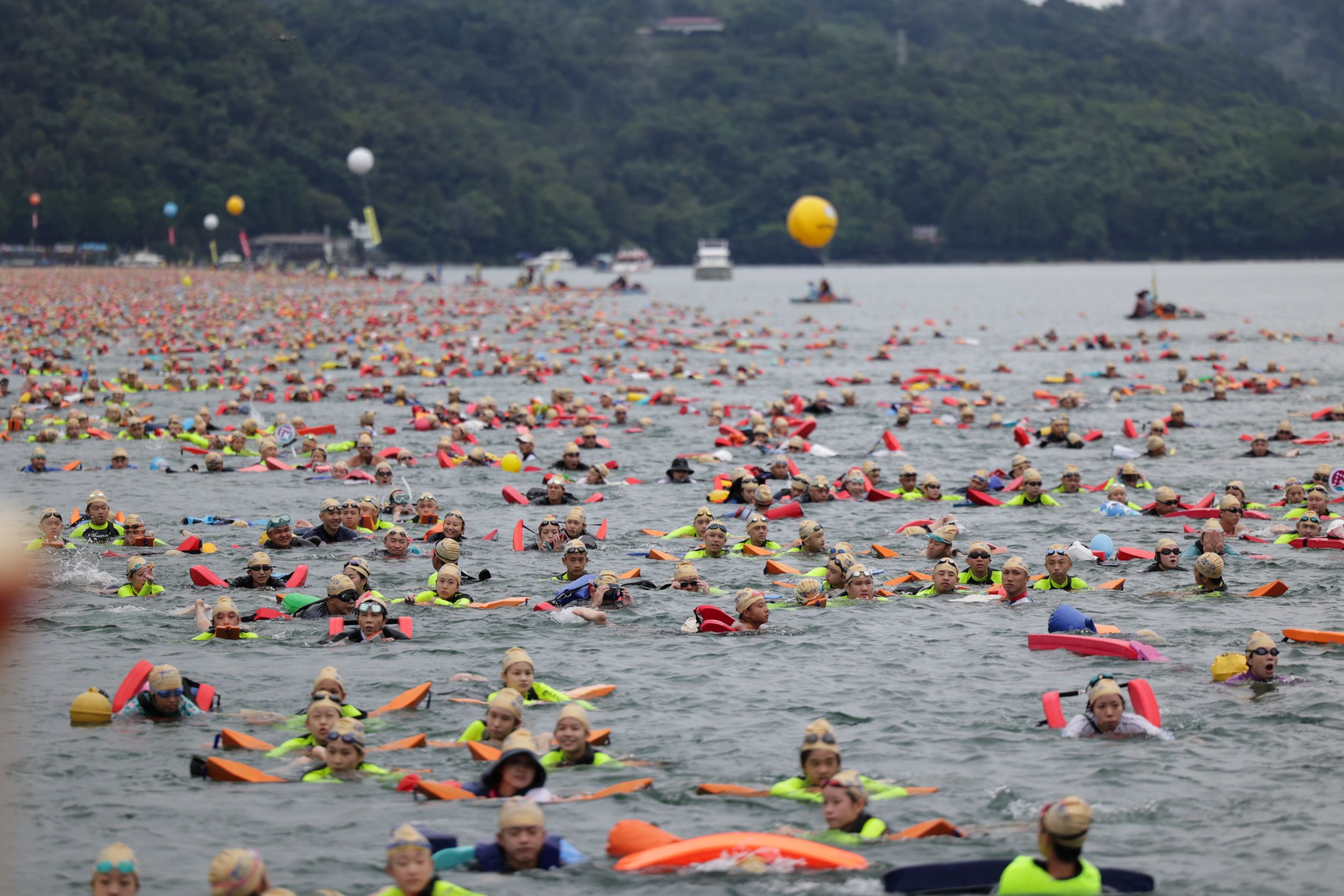 今年日月潭萬人泳渡盛會參加隊伍有1669隊,報名人數計 18709人,包括在台外籍泳客 286 人及180位身障泳士,其中聽障泳者范榮玉,曾四度參加夏季聽障奧運會羽球比賽,並拿到 2013年女單金牌,同隊視障洪國展、呂冠霖也曾參加2018 年波斯頓馬拉松,他們堅持永不放棄的精神與勇氣挑戰自我,是泳者的最佳典範。