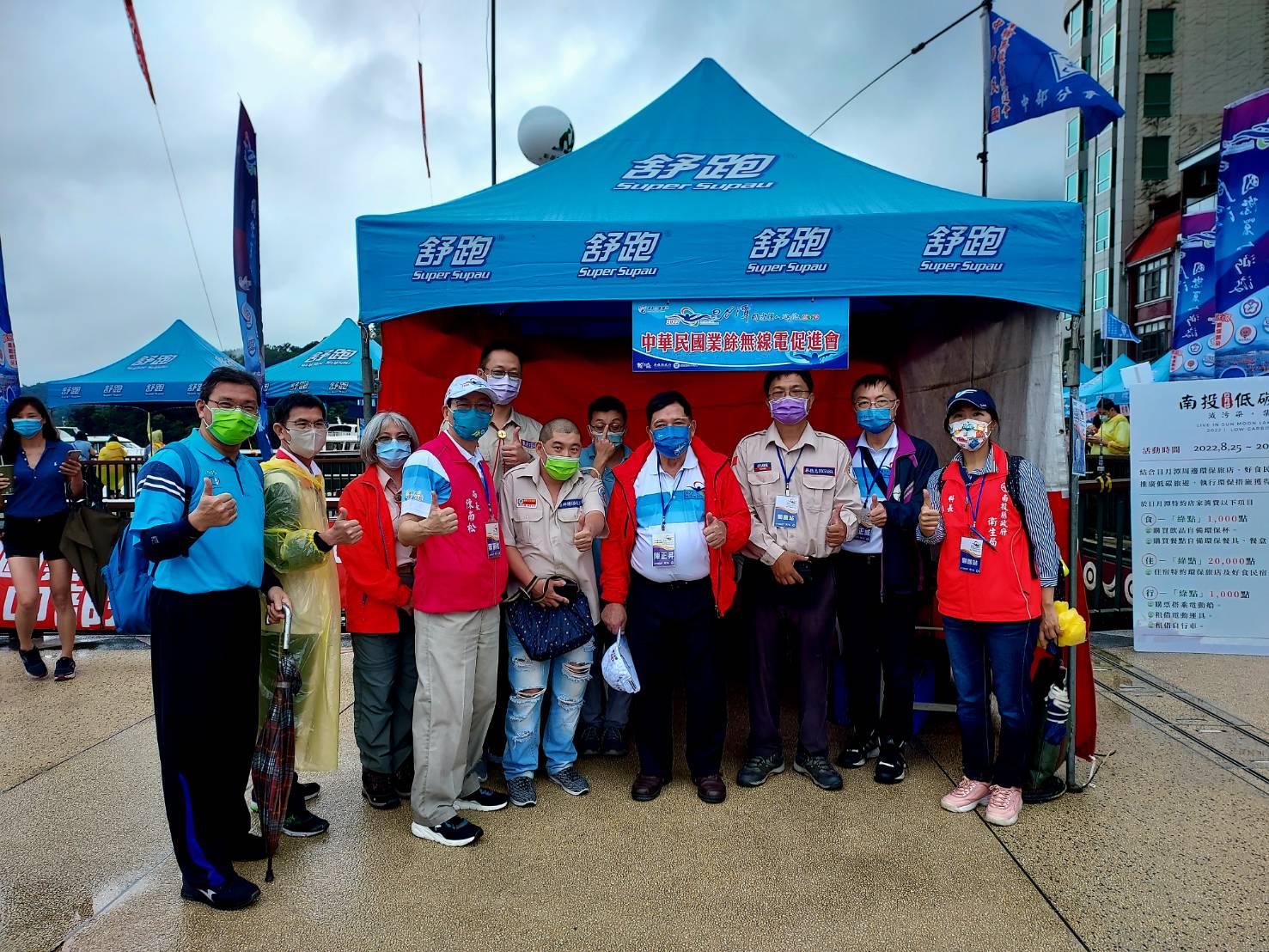 另為使日月潭萬人泳渡活動發揚國際,特請中華民國業餘無線電促進會申請日月潭萬人泳渡無線電臨時站台(Sun Moon Lake International Swimming Carnival),無線電志工陳建仲表示,配合衛生局已多年參與這項活動,讓各救護站資訊聯繫更通暢,本會屬於國際業餘無線電聯盟會員,主要進行緊急救援通信服務,如921集集大地震、桃芝颱風等,此外也支援各項災防演練、大型活動。