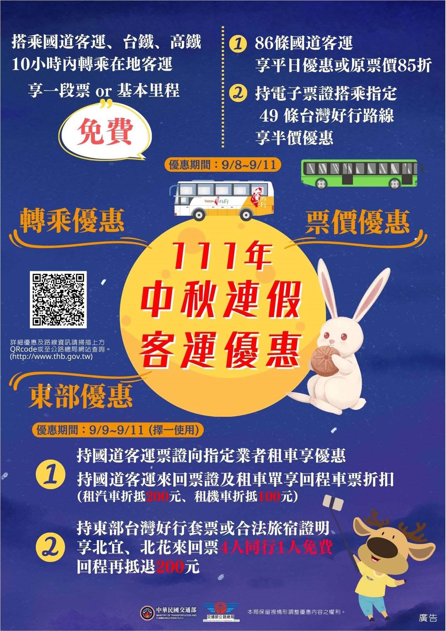 中秋連續假期出遊,東部限定再加碼(111年9月9日0時至9月11日24時),凡購買宜蘭、花蓮、臺東台灣好行套票(4人均須參加)或持東部合法旅宿業住宿憑證,即可享往返東部地區之國道客運路線4人同行1人免費(包含往返車資),返程再抵 200元票價優惠。