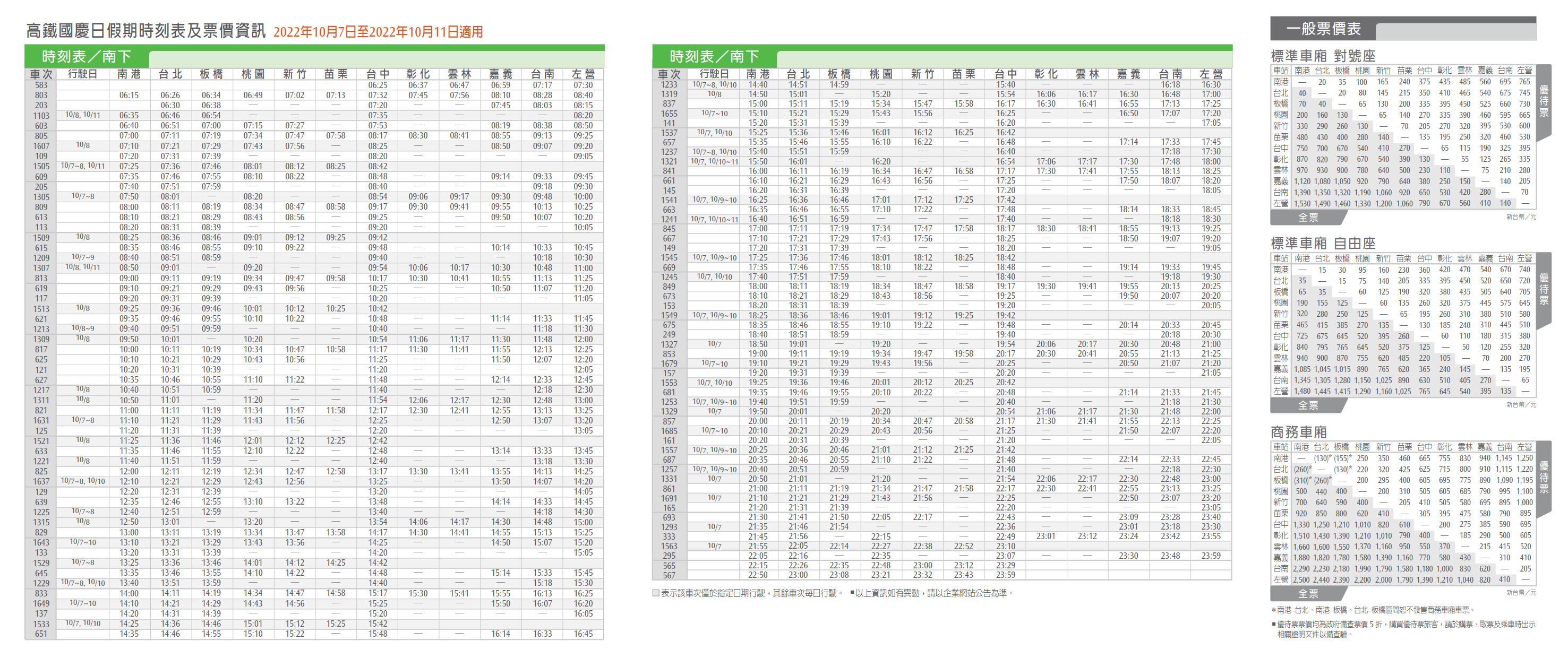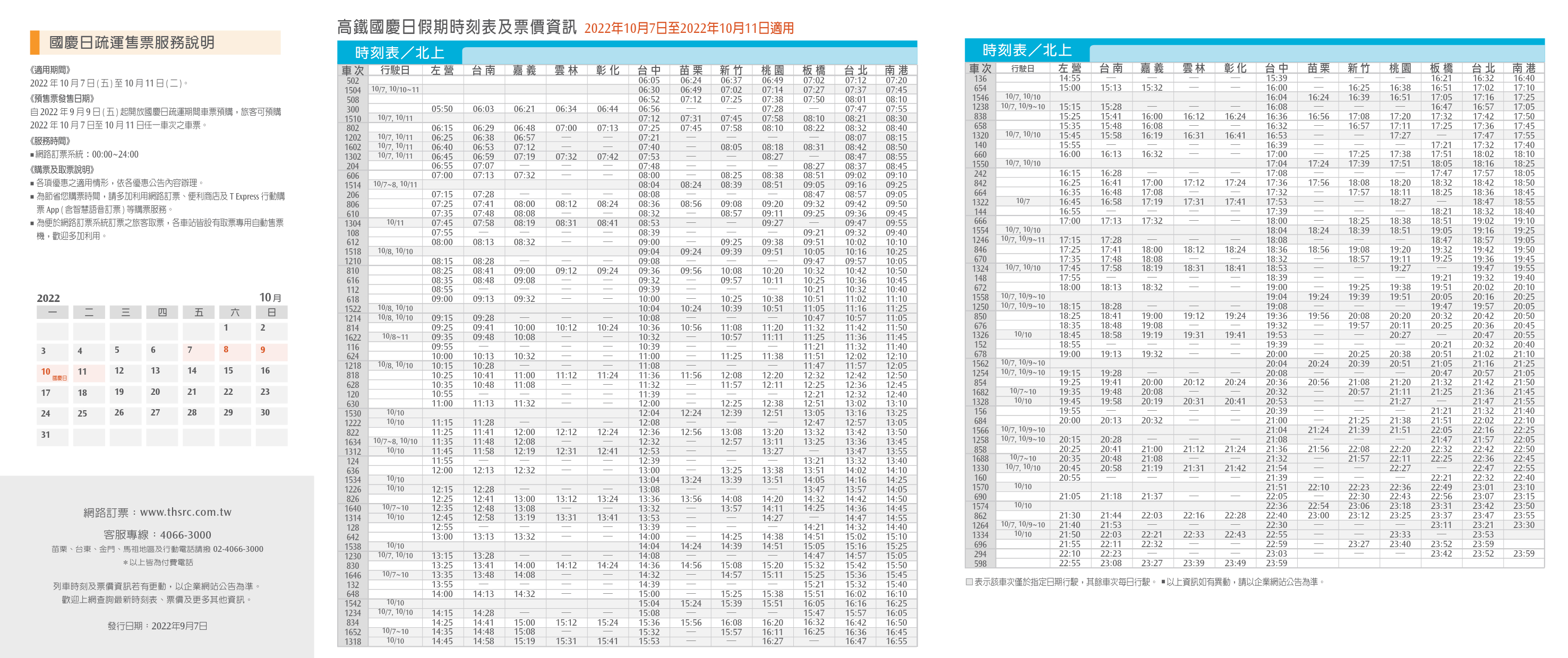 台灣高鐵公司為服務國慶假期間之旅運需求,自10/7(五)至10/11(二)規劃為期5天的「國慶疏運」,期間加開101班次列車(南下47班、北上54班),疏運期間總計提供824班次的旅運服務。