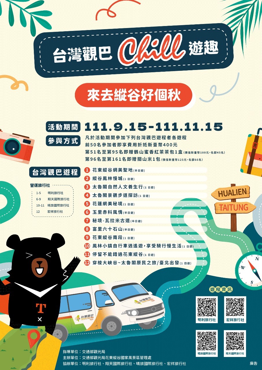 時序入秋,隨著悠遊國旅個別旅客住宿優惠活動已於111年9月8日結束。交通部觀光局花東縱谷國家風景區管理處(下稱縱管處)為推廣台灣觀巴優質遊程,從市場機制延續花東國旅熱度,將在111年9月15日至11月15日間祭出「台灣觀巴Chill遊趣~來去縱谷好個秋」活動,精選12條花東台灣觀巴遊程,優先訂購者將可享費用折抵,或獲贈花東縱谷特色伴手禮一份!