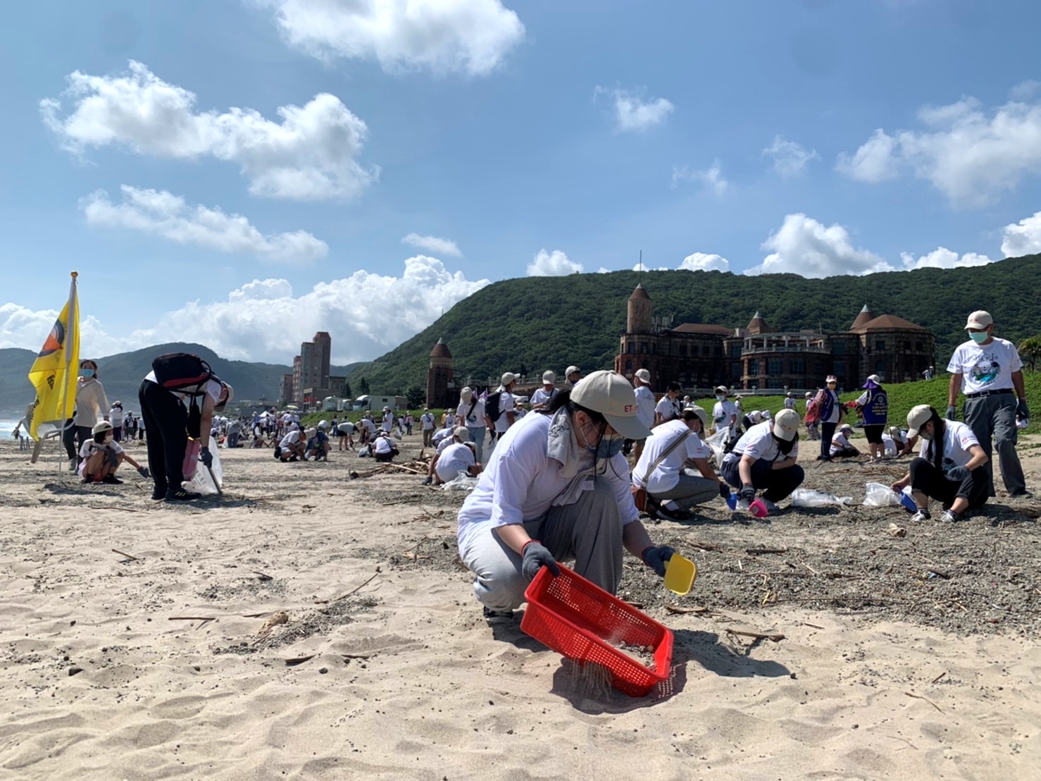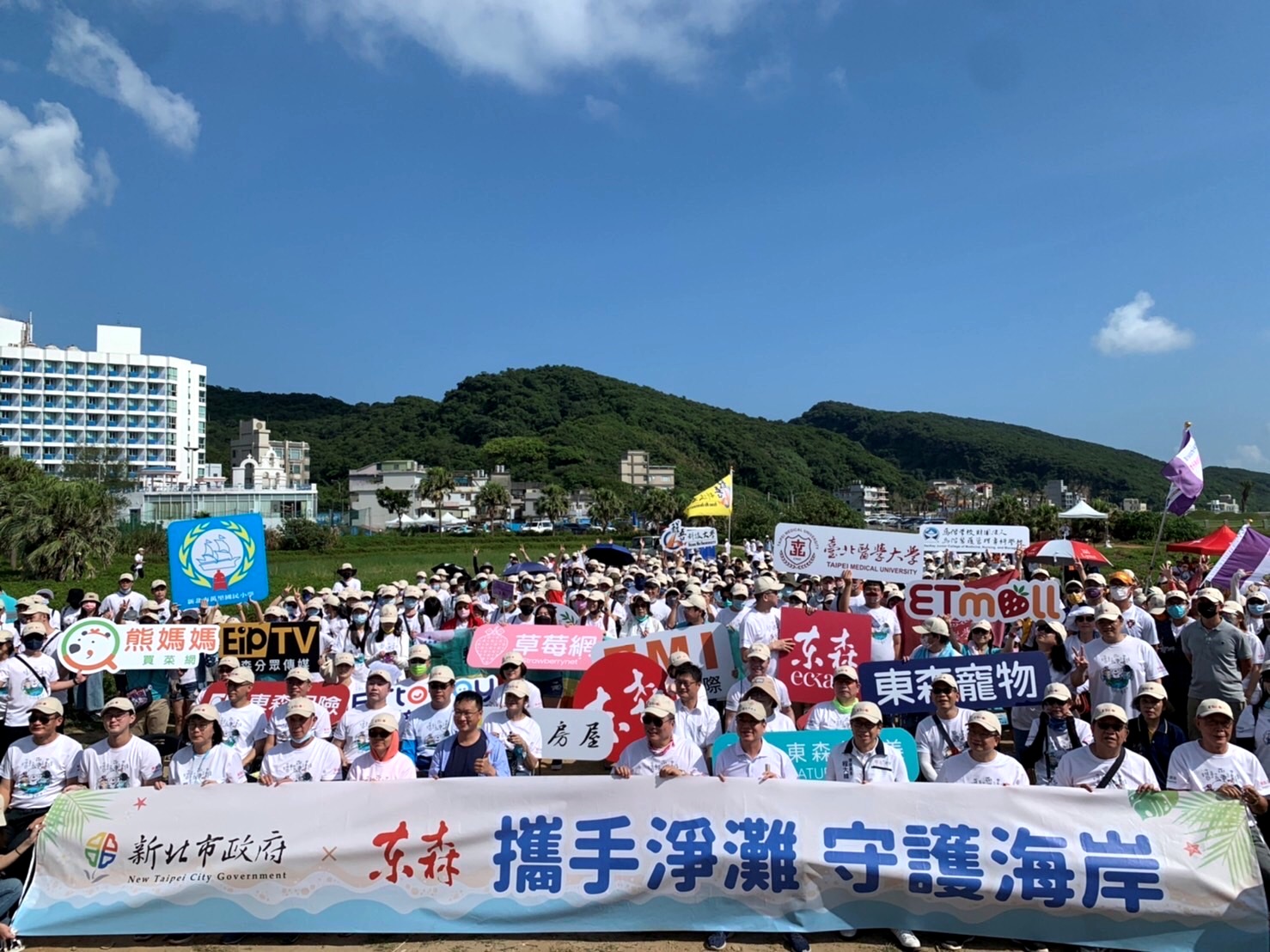 新北市府17日與東森集團合作於萬里翡翠灣海岸辦理「攜手淨灘 守護海岸」活動,號召近800人參與
