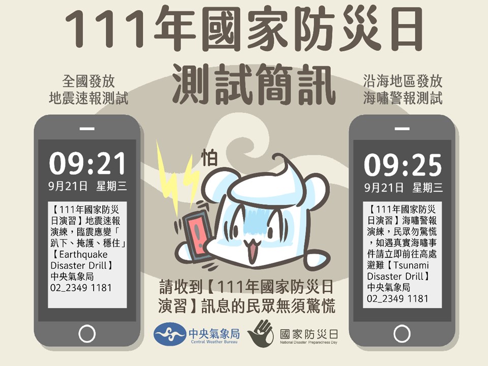 新竹縣政府消防局表示,9月21日上午9點21分、9點25分將先後發布地震及海嘯的演練告警訊息,訊息會明確標示「111年國家防災日演習」字樣。民眾接獲地震演練告警,請一起演練抗震保命3步驟「趴下、掩護、穩住」。當天接到海嘯警報演練,請民眾勿驚慌。