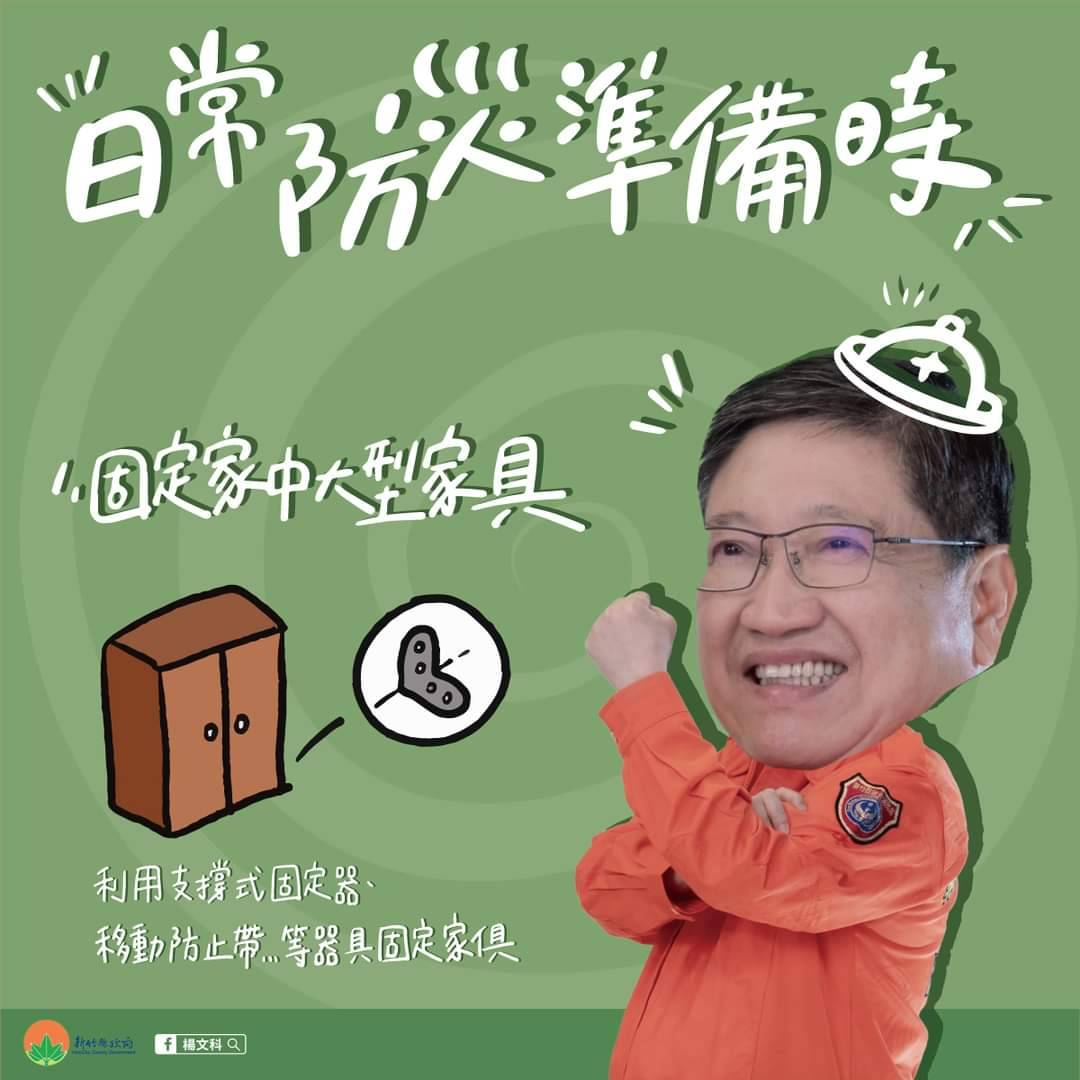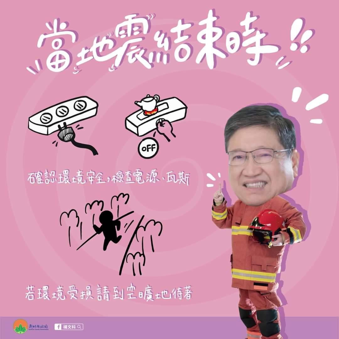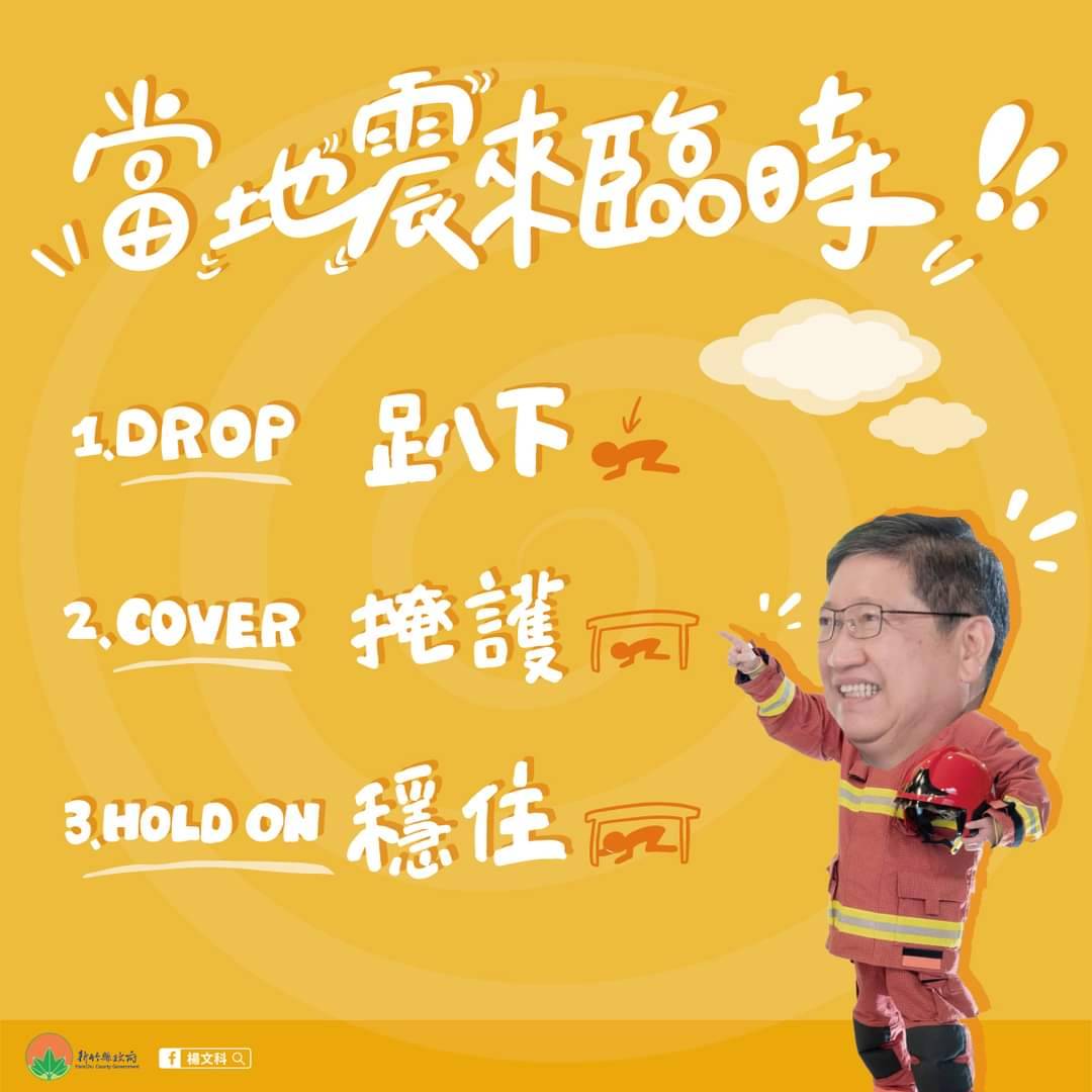 縣長楊文科表示,近日地震頻繁發生,呼籲鄉親要建立地震防災應變能力,平時就要固定家具、準備「緊急避難包」,萬一發生地震勿慌張,最重要的就是保護頭、頸部避免受傷,應立即做好三個動作「趴下(DROP)、掩護(COVER)、穩住(HOLD ON)」,躲在桌子下時可握住桌腳,當桌子隨地震移動時,桌下的人也可隨著桌子移動,形成防護屏障,才能將災害損失降到最低。