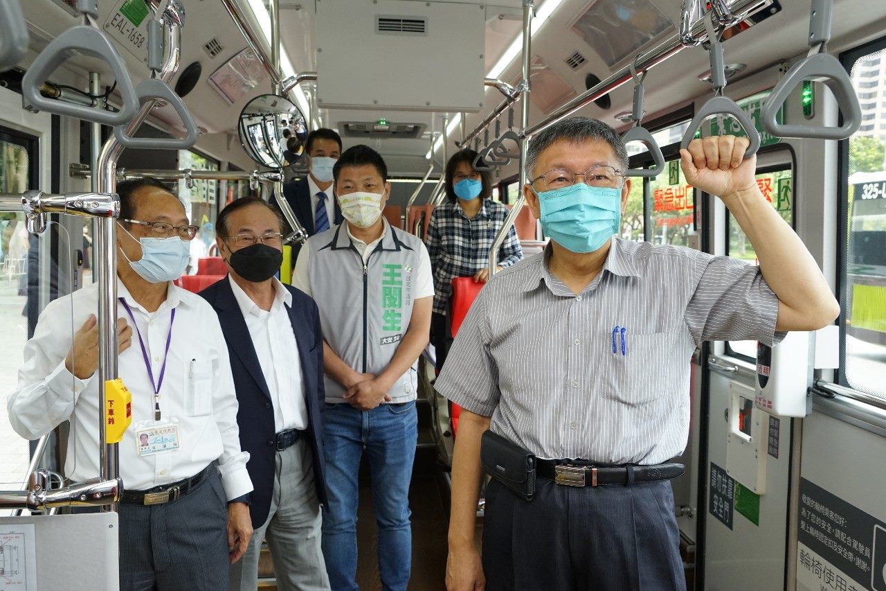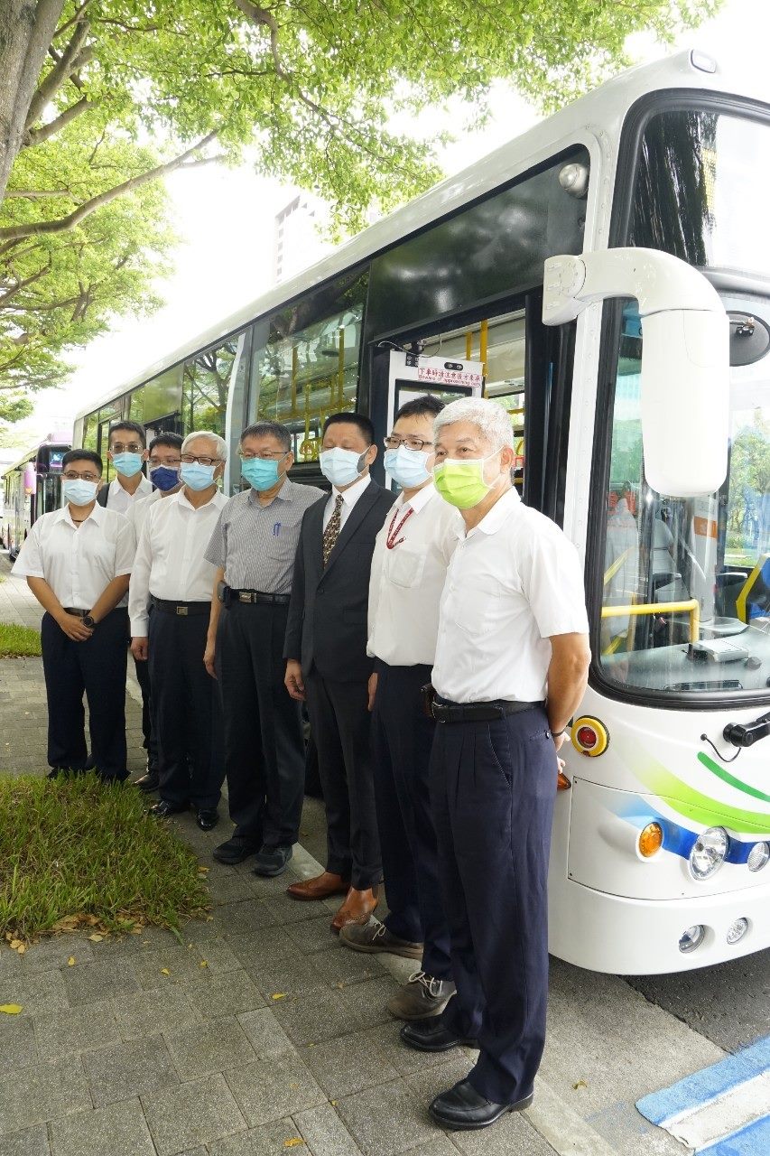柯文哲說,2050淨零排放,讓臺北市朝宜居永續城市發展,全面使用電動公車勢在必行,大約8年後,燃油公車就會全部汰換,也就是在2030年,會有超過3000輛電動公車。這也牽涉很多問題,電量夠不夠,變電所要不要加開,都必須要思考。現在到年底會有400輛上路,期許臺北市的公車繼續一路進步,希望2030年達到全面電動公車目標。
