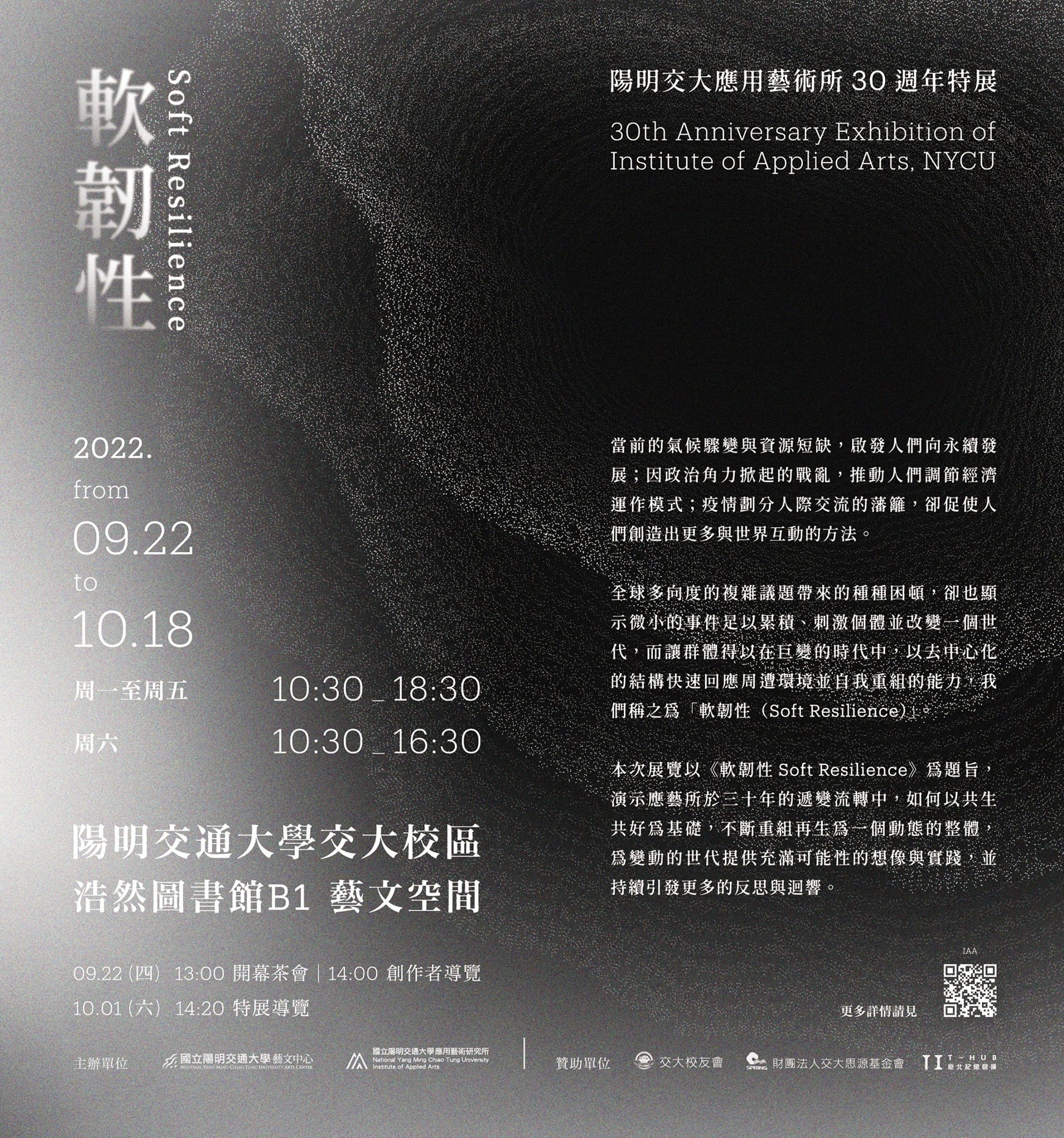 陽明交通大學應用藝術研究所成立至今已邁入了第30年,今年特於交大藝文空間9月22日到10月18日盛大舉辦『陽明交大應用藝術所30週年特展』,以『軟韌性』作為展題來傳達在這動盪三十年來,應藝所在這片充滿嚴謹學理技術的校園中,對藝術與人文的強韌堅持,還有師生們相互依存、共生下,默默孕育出豐富可能性的未來。