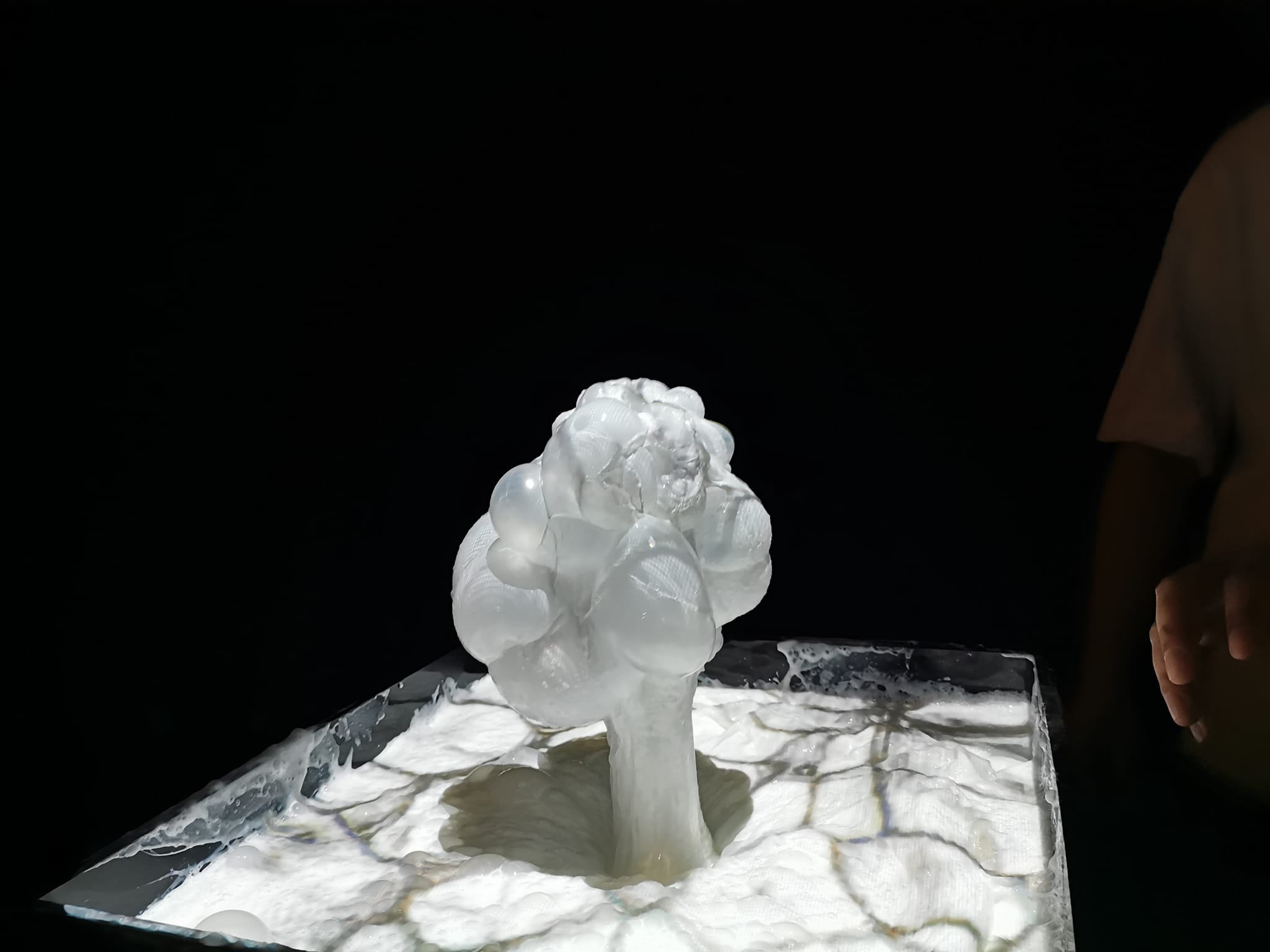 在裝置作品上,許峻誠所長與吳元劭、顏瑋辰、許巧妮研究生團隊打造的作品《異生命演繹》以生命的起源為靈感,透過自行研發的膠性黏液,在空間中以泡泡創造出一系列從出生、茁壯到死亡的成長過程,也演繹一個生命的週期;黃彥翔、鄭任翔、葉韋鉦三位創作團隊「雜波創造 HwH Project」於展覽入口處的《遨遊夜精靈》將棲息在六燃大煙囪的蝙蝠生物們結合成裝置意象,帶領觀者一虧六燃獨有的保育生態;林欣怡老師的《鯓語:刺聲編碼》透過編織與程式碼結合為有形數據,探究數據編碼與編織圖案的文化重構性。 林欣怡《突觸聲部:城市電磁波疊韻與再作用媒體》將圍繞著城市基礎設施電磁波聲響的探測、城市「中域/環境」中聲音事件的捕捉,以及城市建築中「自然/生物」音響的尋訪紀錄,三種聲線疊韻/疊歌/副歌為個人小型聲音數據庫。