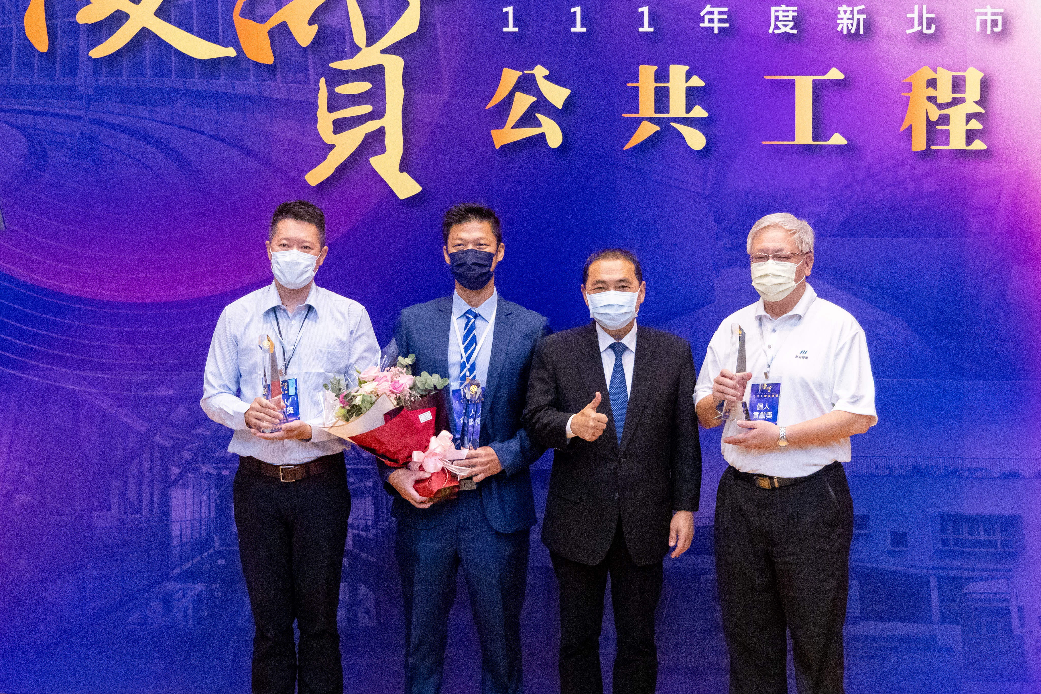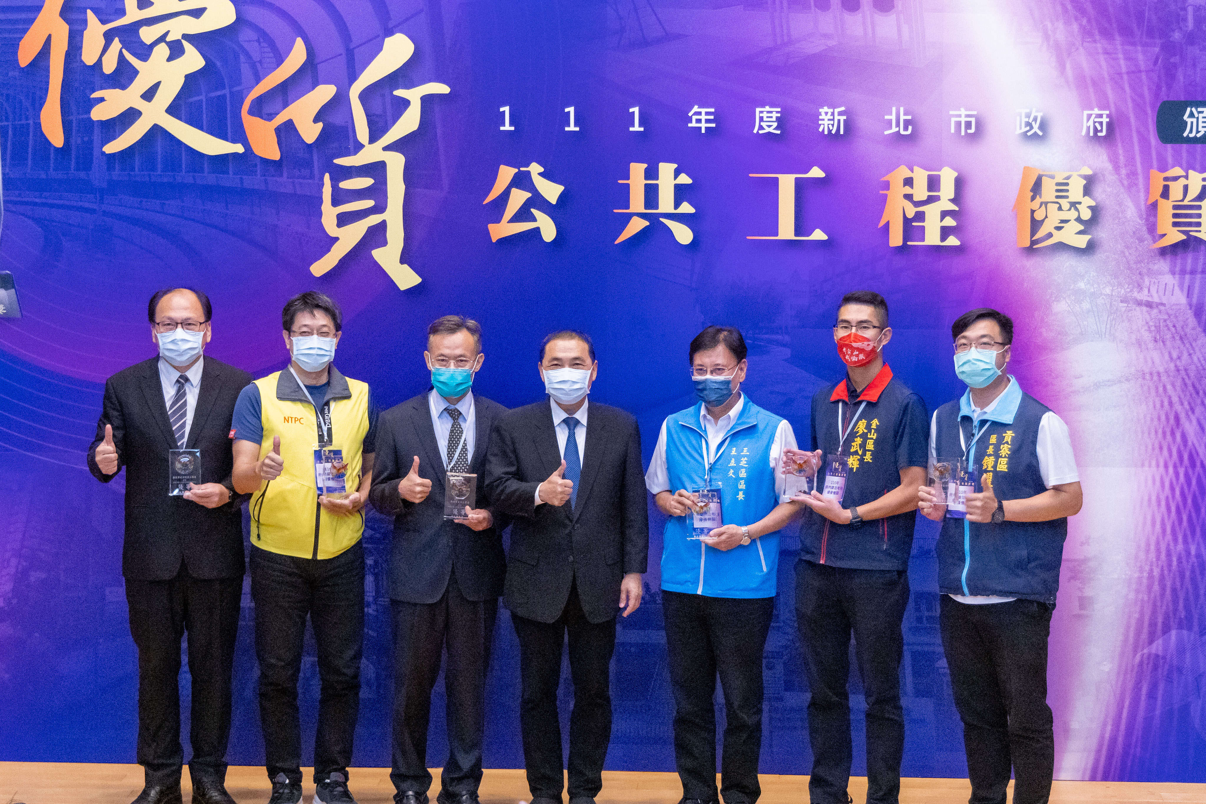 111年度新北市公共工程優質獎頒獎典禮今(26)日在新北市政府舉行,由市長侯友宜頒發10件得獎工程團隊、3位個人貢獻獎同仁,以及110年公共工程執行績優機關獎項,肯定他們為公共工程奉獻的辛勞,帶給市民便捷、舒適的生活環境。