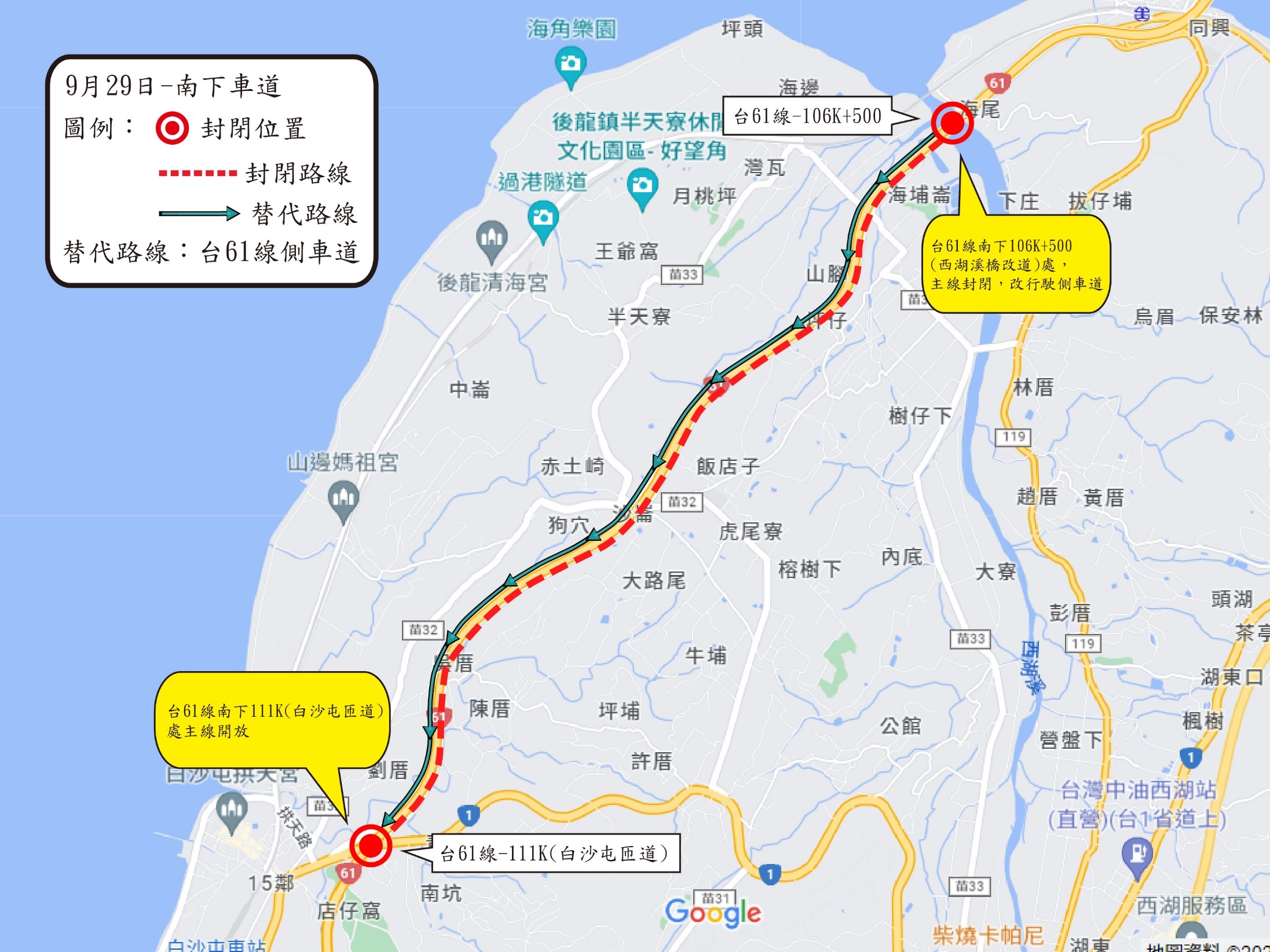 苗栗工務段為為改善台61線後龍~通霄白沙屯南下主線車道路面服務品質,自111年9月30日上午9時起至10月1日日下午17時止,封閉台61線106K+500~111K+000南下主線車道,原行駛於該路段之所有車輛於台61線106K+500(西湖溪橋改道)匯出,行駛側車道至111K+000(白沙屯匝道入口)再匯入快車道往南行駛。