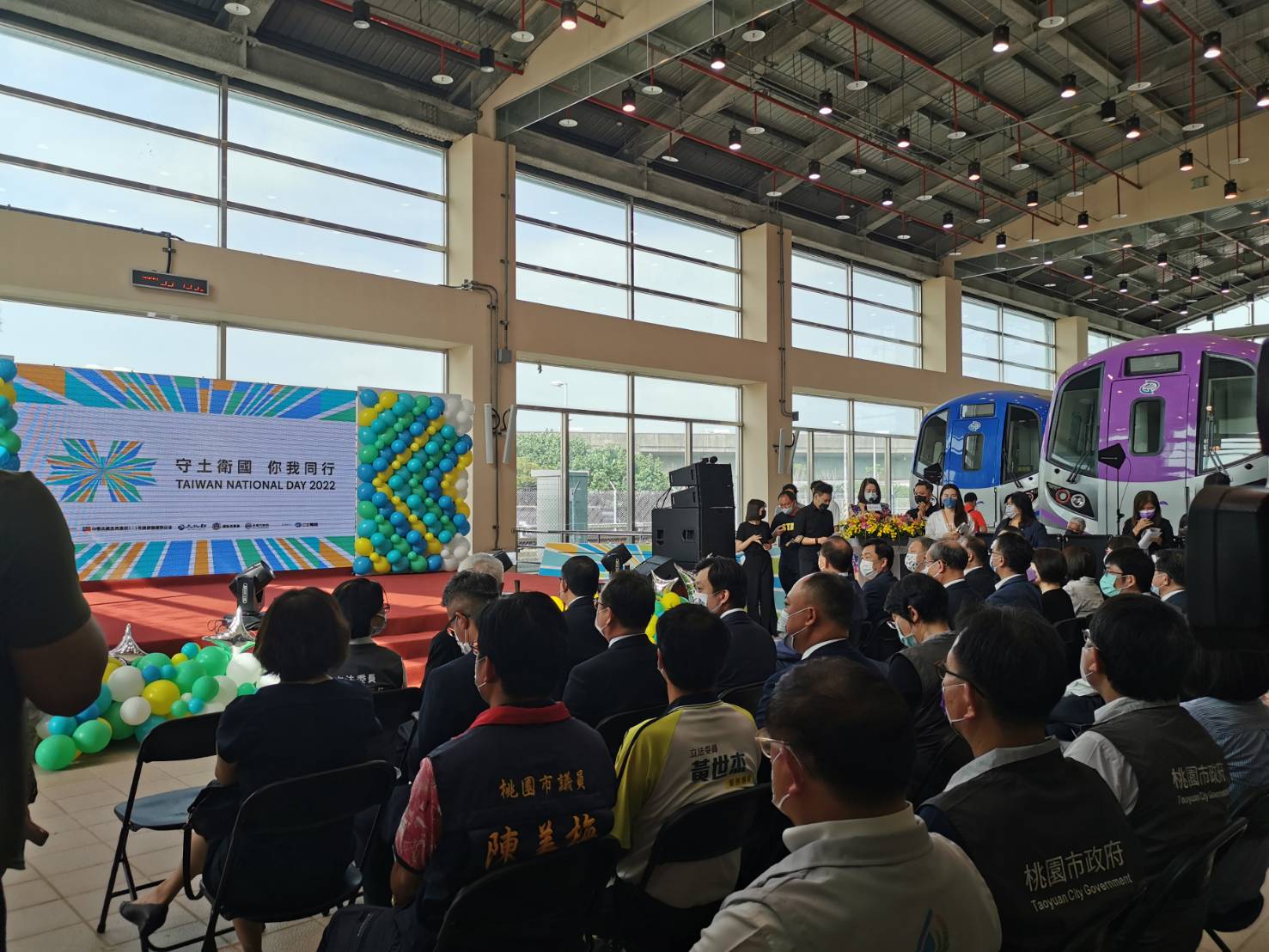 鄭市長也說,桃園陽光劇場緊鄰桃園機場捷運A17領航站,交通便捷。國慶晚會當天周邊道路包含領航北路四段、大成路二段、大豐四街將進行交通管制,禁止一般車輛進入,請民眾搭乘公車前往桃園高鐵站,再轉乘機場捷運或接駁車前往活動會場。