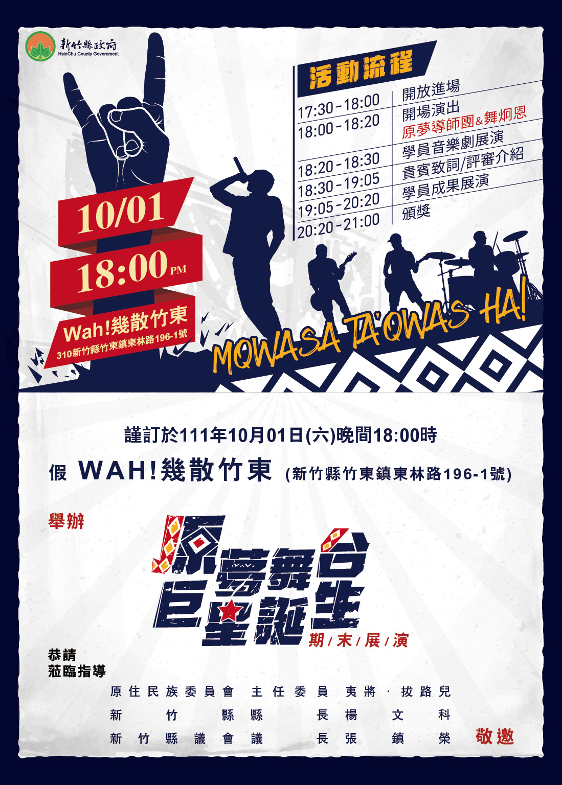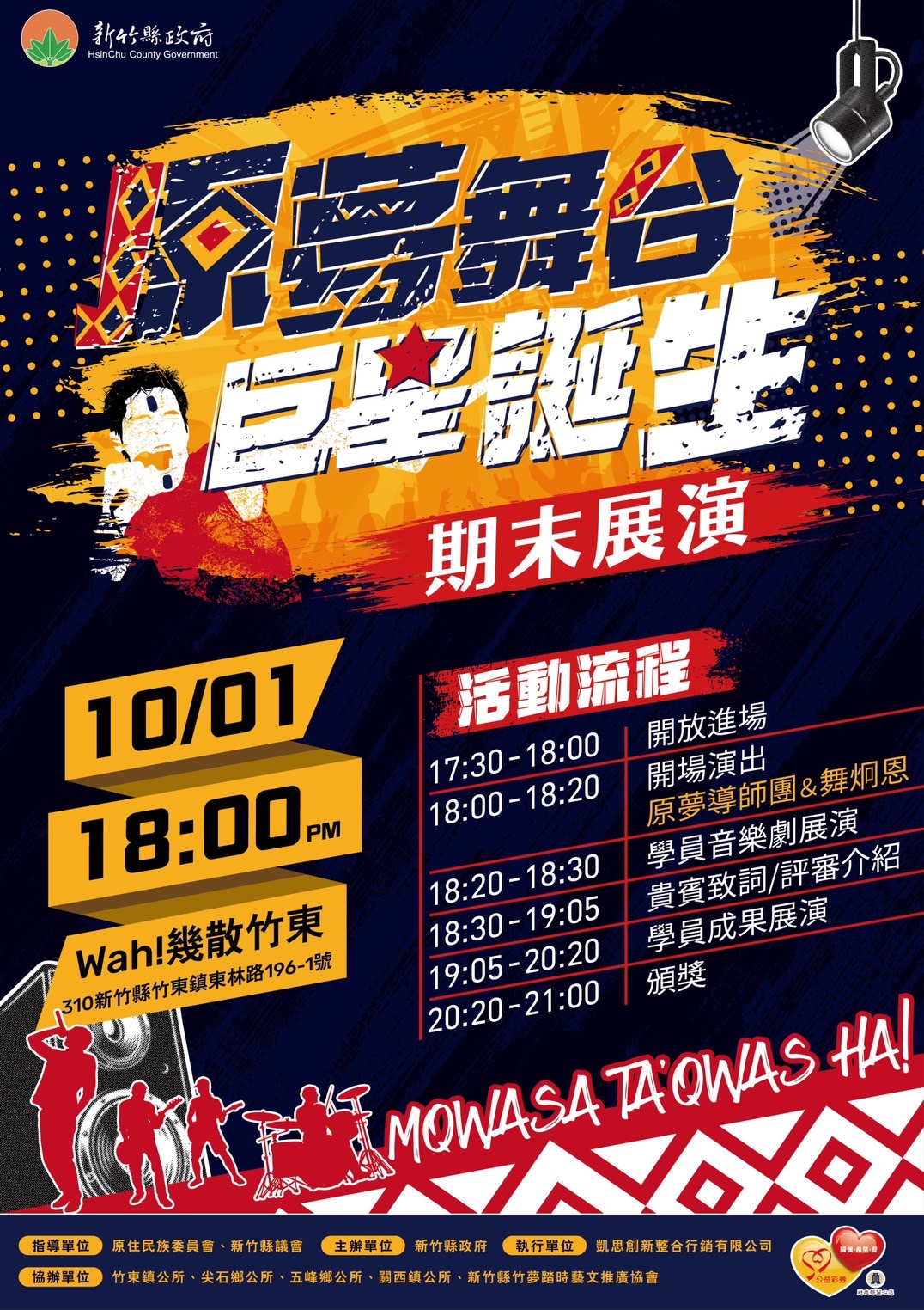 舞動原鄉.傳唱故事之「原夢舞台.巨星誕生」期末展演10月1日晚間在縣內首座原鄉音樂文創聚落「Wah!幾散竹東」登場,帶來精采原民歌舞表演,現場熱鬧滾滾。