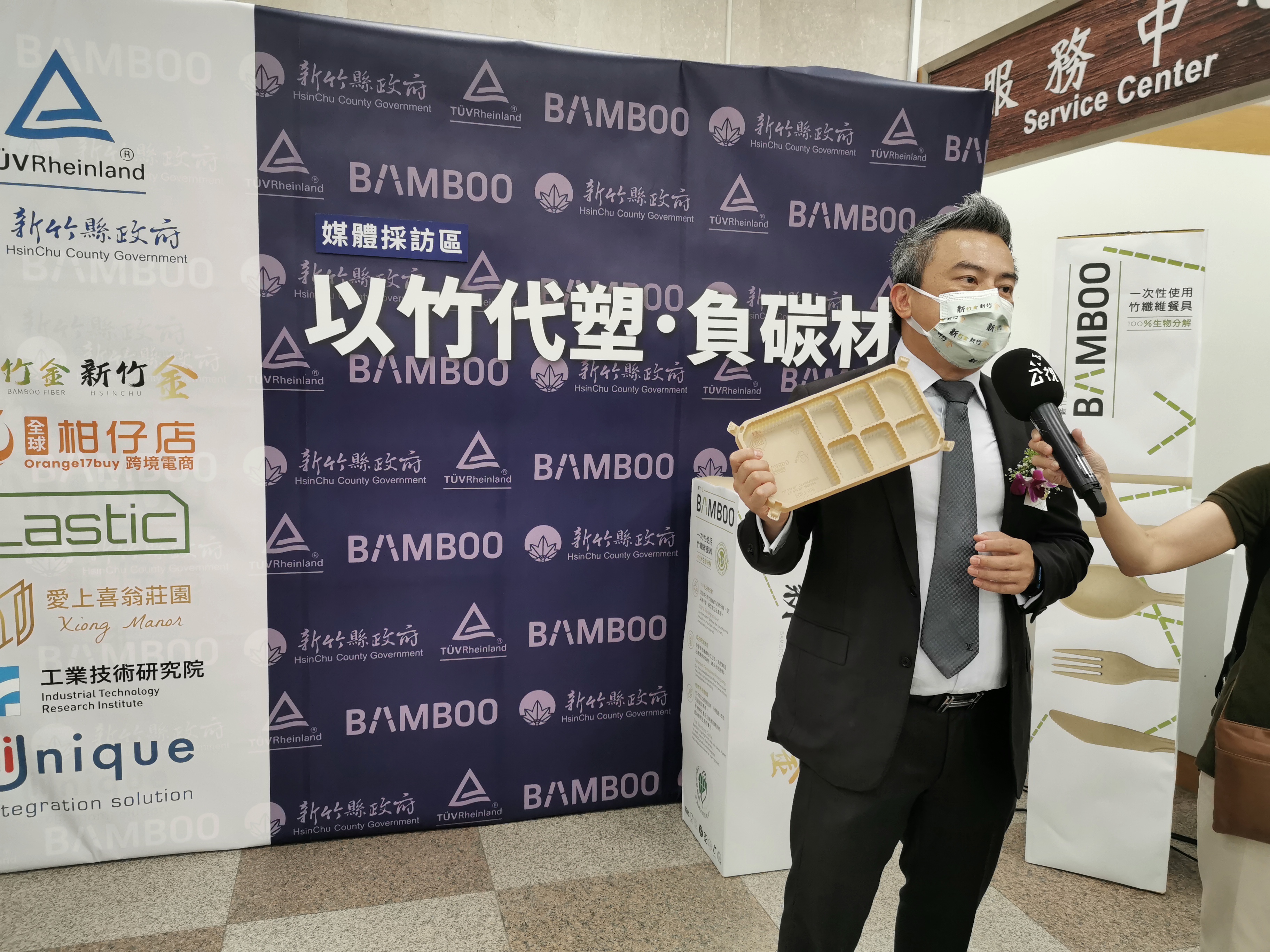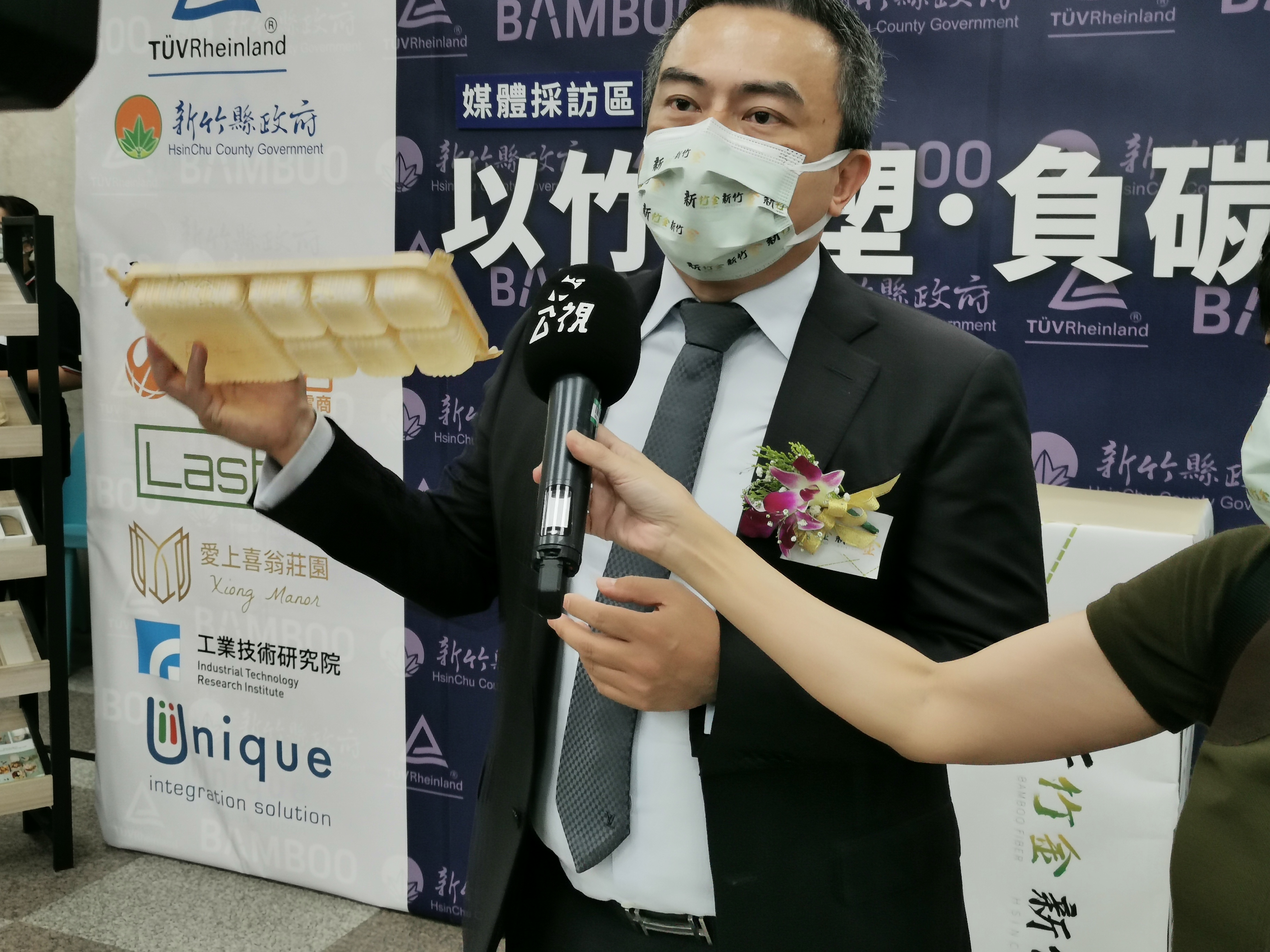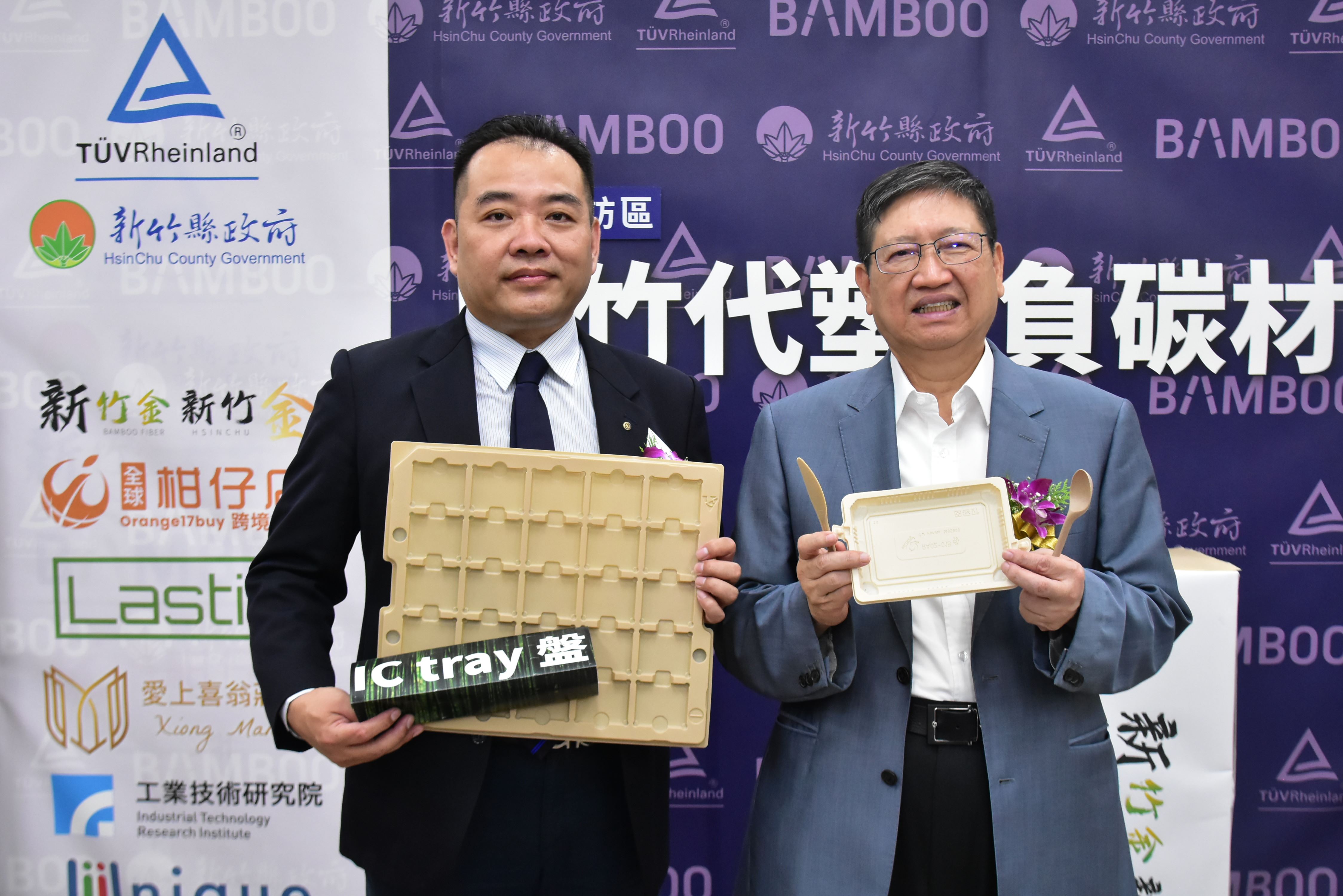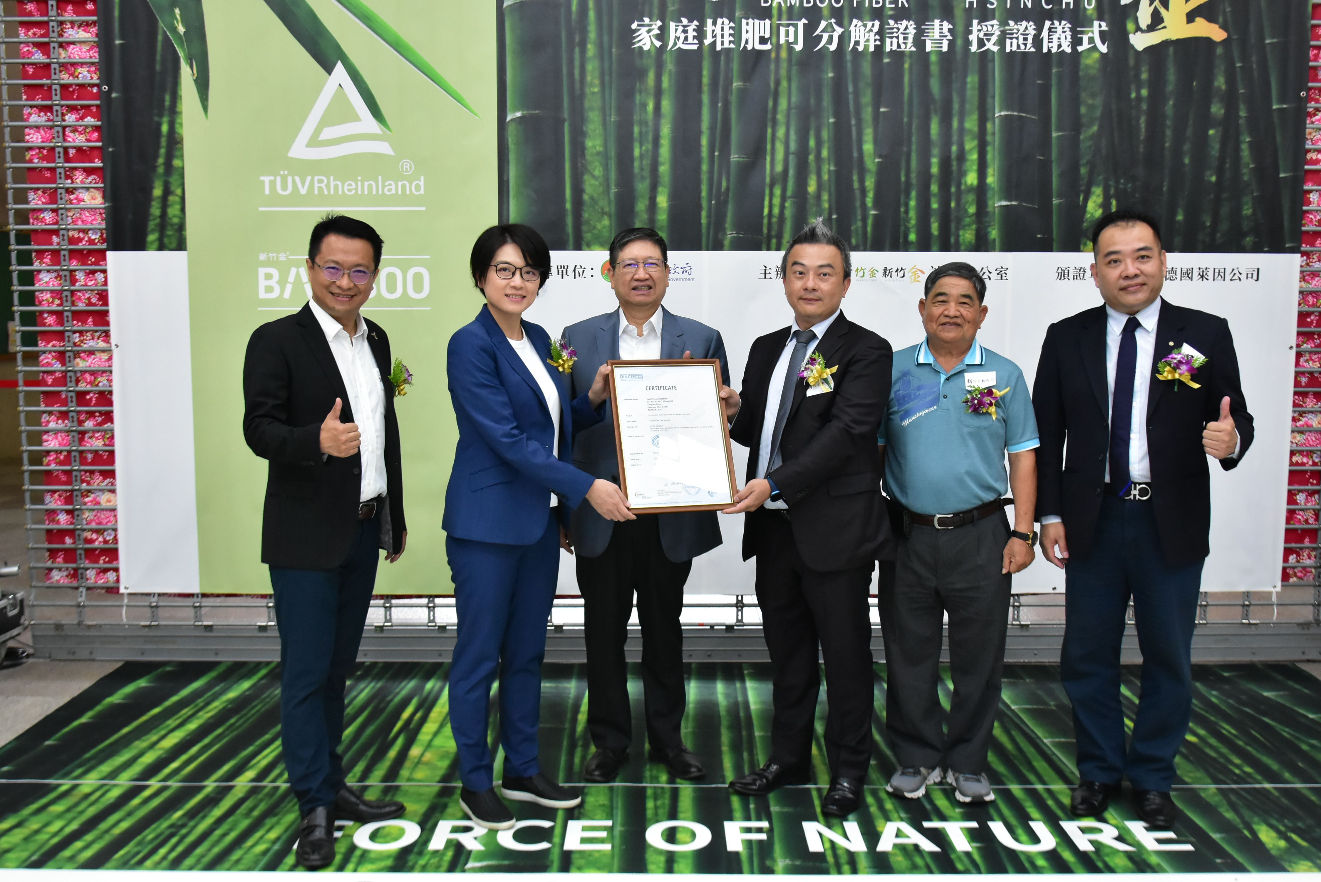 「新竹金新竹金」竹產業計畫團隊研發竹纖維原料,獲德國萊因集團(TÜV Rheinland Group)檢驗,並取得德國驗證機構DIN CERTCO生物「可分解材料家庭堆肥」以及「生物可分解材料工業堆肥」雙證書,今(4日)在新竹縣長楊文科見證下頒證,楊文科也深深肯定計畫團隊為環境保育所做的努力。