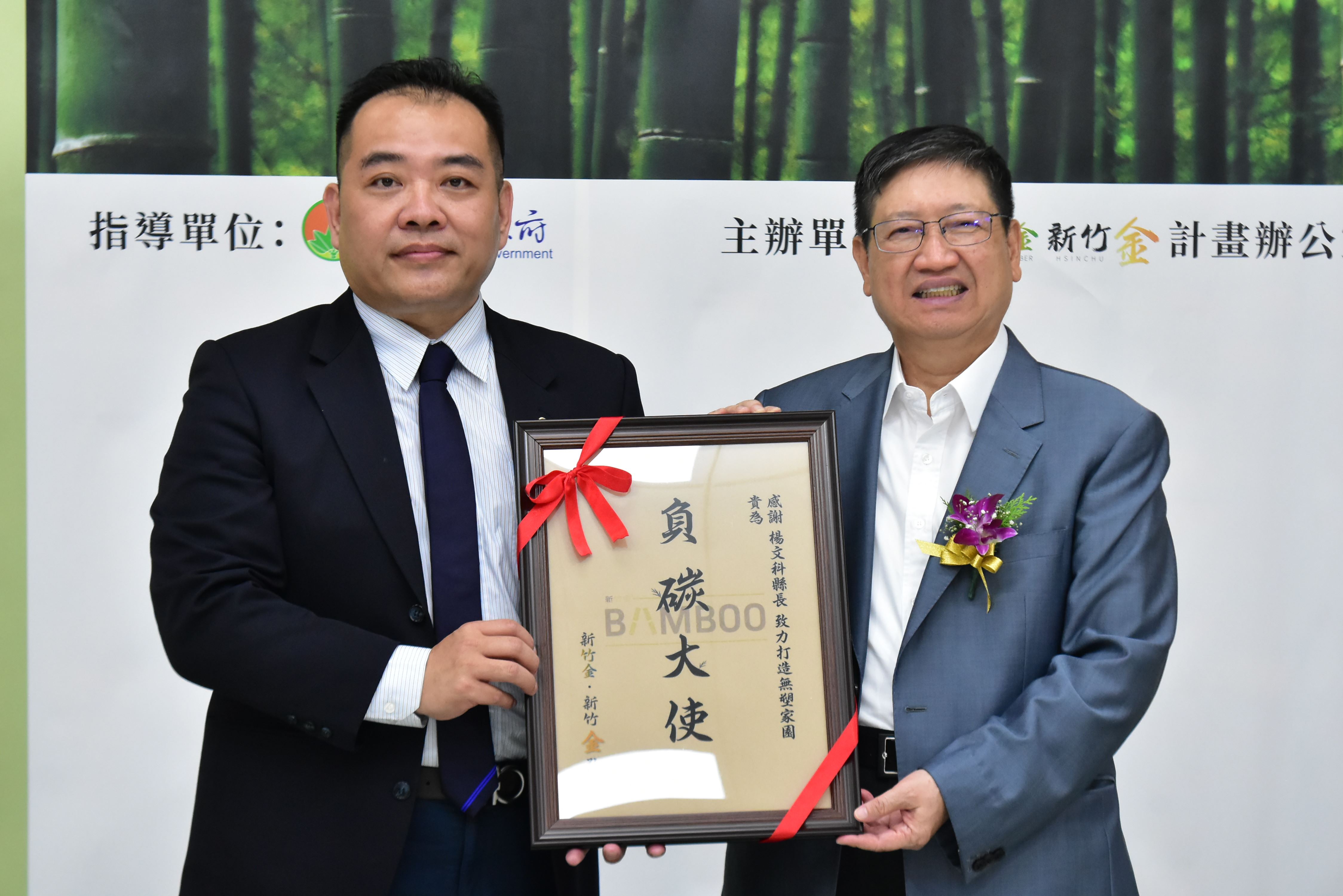楊文科說,恭喜「新竹金新竹金」竹產業計畫團隊獲頒證書,這是台灣首次,團隊在致力推動竹製品餐具深獲肯定。希望大家多多利用竹製品,讓台灣早日步入減塑、節能減碳的示範國家。