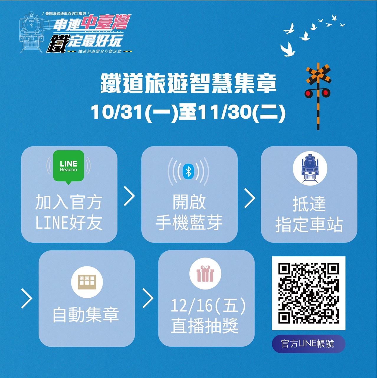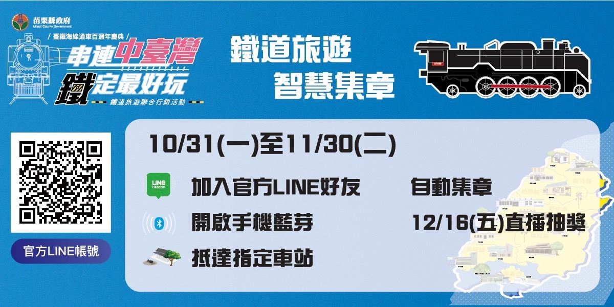 文化觀光局長林彥甫表示,「中臺灣區域治理平台」聯合行銷活動繼2021年的自行車主題活動之後,今年主題訂為「鐵道主題旅遊」,因此苗栗縣攜手中臺灣其他六縣市,推出「串連中臺灣 鐵定最好玩 鐵道旅遊智慧集章活動」,活動期間為10/31(一)至11/30(三),參加者只需要一鍵加入活動官方LINE好友,前往官方指定的14個特色車站,並且開啟手機藍芽,就可自動進行集章,完成指定數量的集章任務即可參加抽獎活動,最多集滿4個章就有機會抽中Gogoro機車、iPhone手機等精美好禮,還有各縣市限量參加獎等你來拿。此外,本次活動更與車站周邊的餐飲業、旅宿業、伴手禮業等超過百家優質商家進行合作,活動期間至合作店家消費,憑官方LINE好友畫面更可享有獨家限定優惠,邀請大眾一同來搭火車,玩遍中台灣。