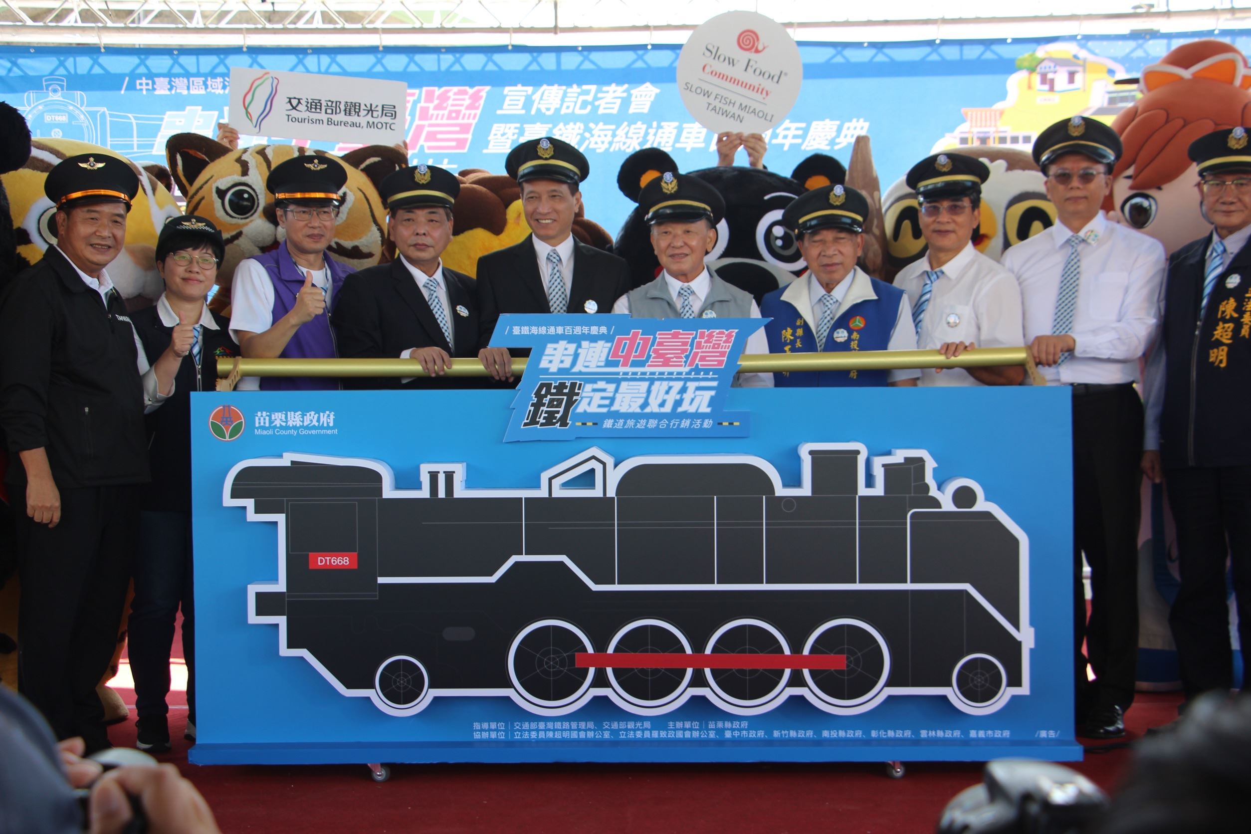 「中臺灣區域治理平台」成員:新竹縣、苗栗縣、臺中市、南投縣、雲林縣、彰化縣、嘉義市共七位縣市首長以及各縣市吉祥物齊聚一堂,結合Line Beacon行動智慧科技集章活動,攜手推廣行銷中臺灣鐵道主題旅遊,共同慶祝臺鐵海線通車百週年,陳超明立法委員、羅致政立法委員、文化部陳登欽主任秘書、交通部臺鐵局朱來順副局長、交通部觀光局參山處湯維堯副處長、白沙屯拱天宮管委會洪文華主委等長官貴賓也蒞臨參與此次盛會,場面相當熱鬧。