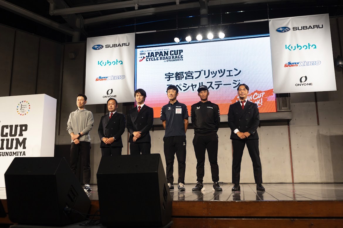 宇都宮閃電車隊在日本盃前一天正式發佈馮俊凱(右2)加盟車隊 圖/圓創運動行銷 提供