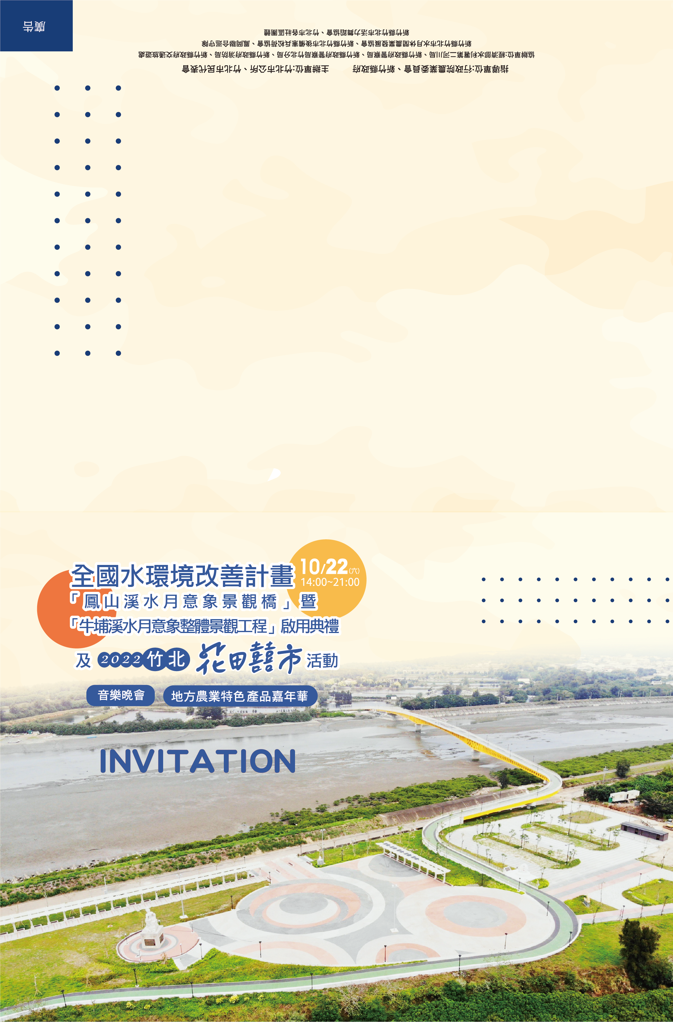 竹北花田囍市暨「鳯山溪水月意象景觀橋」、「牛埔溪水月意象整體景觀工程」啟用典禮於10月22日盛大舉辦。活動從下午2點開始,邀請「單車女神」魏華萱帶領自行車隊試騎體驗,享受輕鬆濱海風光的悠遊。