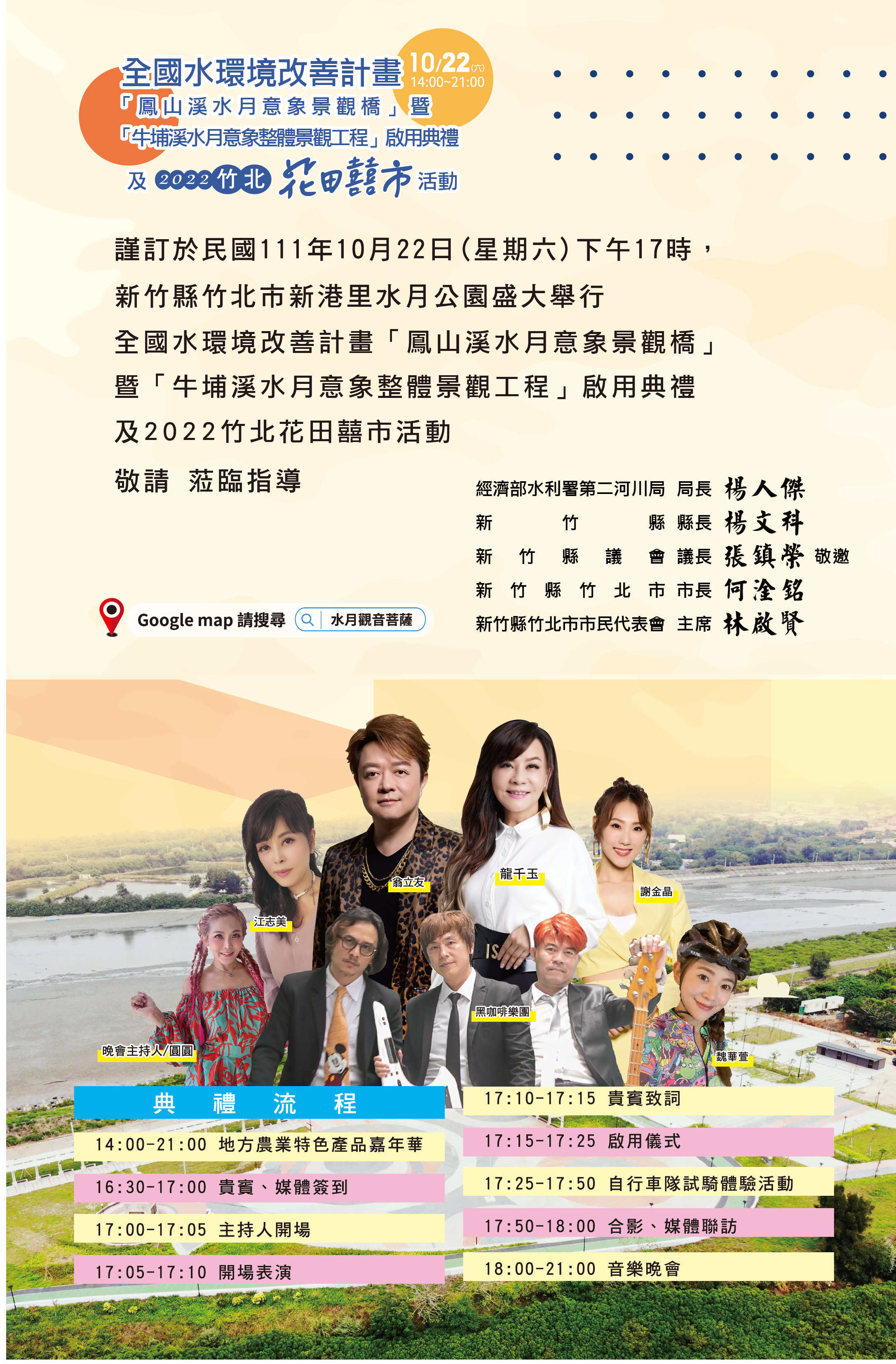 活動現場還設有「地方農業特色產品嘉年華」及精彩的音樂晚會,現場邀請到台語歌王翁立友、台語歌后龍千玉、江志美及謝金晶等歌手獻唱,邀請大家一起前來共度盛宴。 全國水環境改善計畫-「鳳山溪水月意象景觀橋新建工程」暨「牛埔溪水月意象整體景觀工程