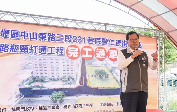桃園市長鄭文燦今(24)日前往中壢區,出席「中壢區中山東路三段331巷底暨仁德街40巷道路瓶頸打通工程」完工典禮。鄭市長表示,市府在中壢區規劃「北富台社會住宅」,同時就社宅周邊路段進行道路瓶頸打通工程,包括「仁德街40巷」渠道加蓋作業,規劃長90米、寬10米的新闢道路;「中山東路段331巷」臻品社區前之8米計畫道路,有一側約181米,並未施作側溝,本次工程一併施工,解決排水問題。鄭市長說,本次工程完工後,將使附近聯外交通及社宅進出更加便利。