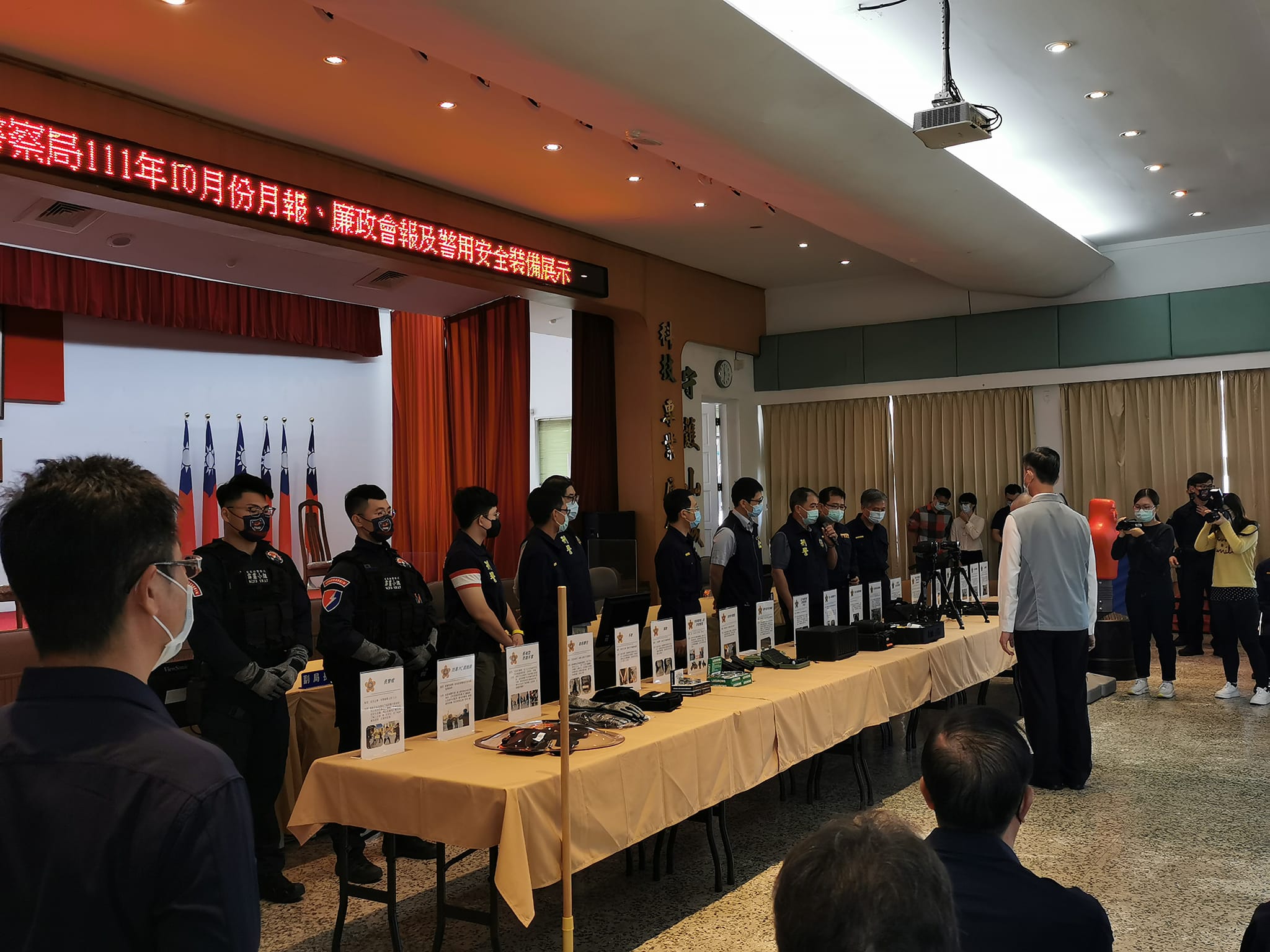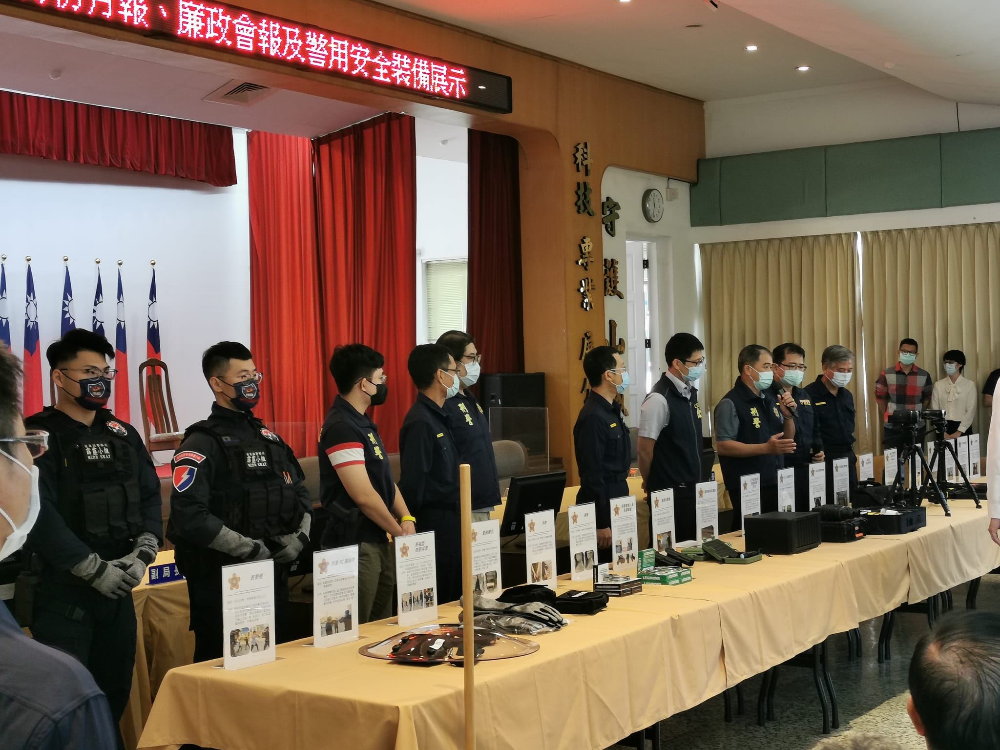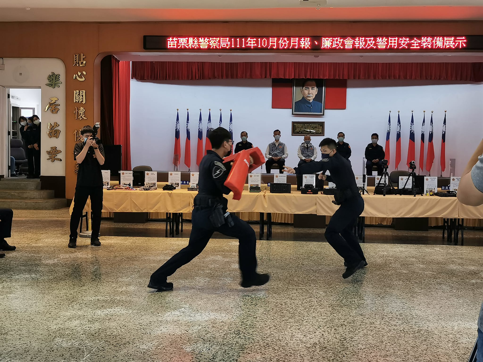今日縣長徐耀昌與警察局長陳武康一同巡視現場展示的新購應勤裝備,並以暴民衝突的情境模擬方式,演練各式新購裝備的使用時機,員警展演動作逼真精實,迅速平息劍拔弩張的緊急狀況,凸顯新購裝備的實用性,確保員警們的執勤安全。