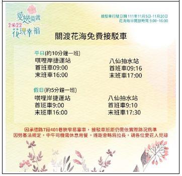 準備搭乘接駁車的朋友,自唭哩岸捷運站1號出口,走至東華街二段捷運唭哩岸站一(東華)公車站等車。活動接駁車往返唭哩岸捷運站、八仙抽水站之間,如要步行、騎自行車前往的民眾,可由唭哩岸捷運站2號出口出發。