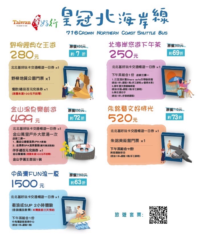 - 台灣好行皇冠北海岸線同步於現場銷售5款旅遊套票(野柳經典女王遊、北海岸悠遊下午茶、金山湯泉樂齡遊、朱銘藝文好時光、中角灣FUN浪一夏),單筆購買任1款套票即送小禮1份,滿750元送皇冠北海岸線隨身包1個,數量有限送完為止!