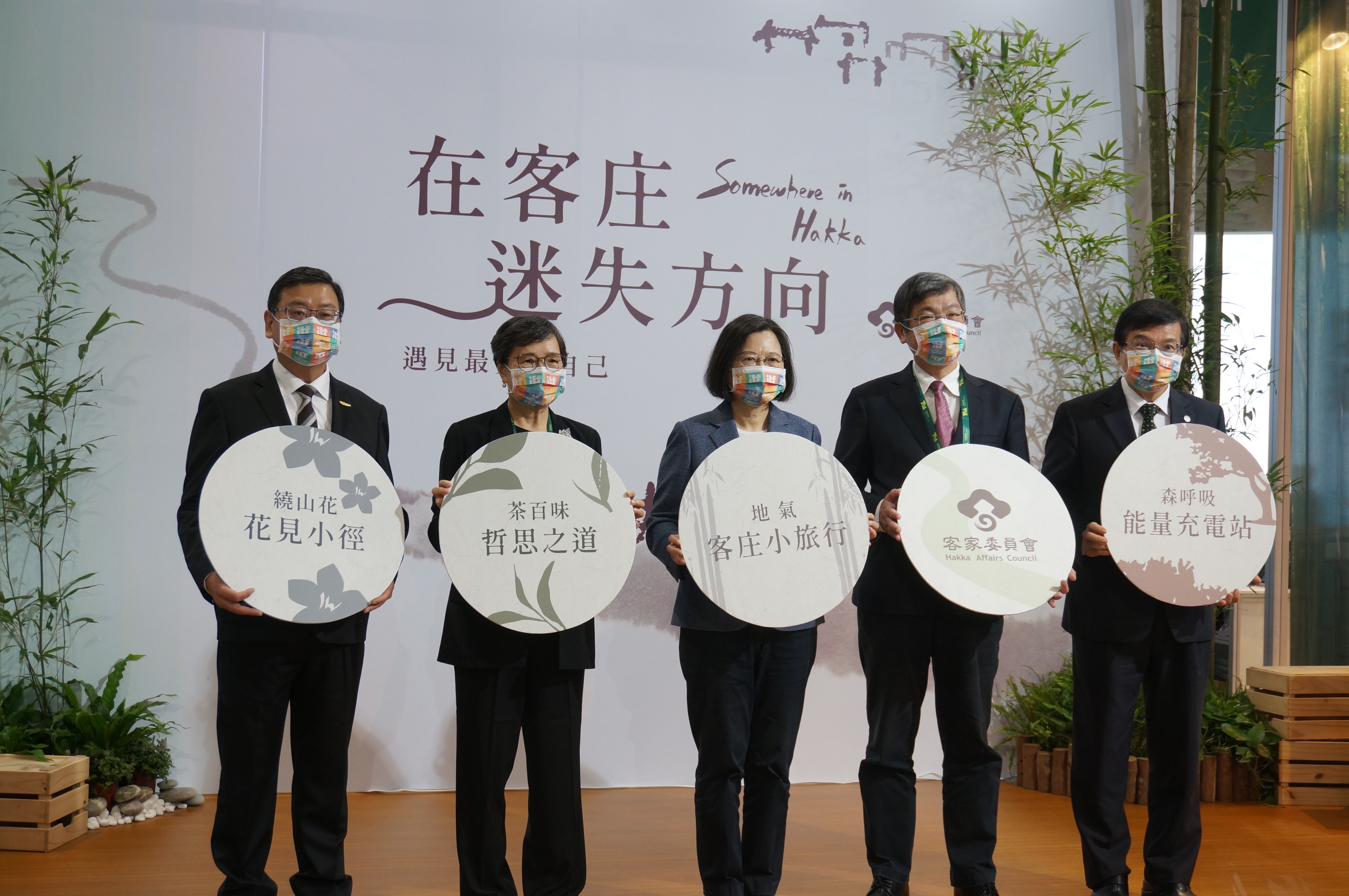 蔡英文總統(中)前來客家館給客家館加油打氣