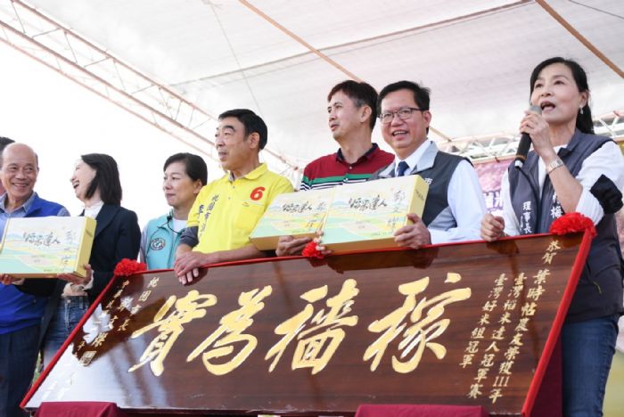 今日鄭市長頒發賀匾給葉時帖農友,並於現場協助冠軍米拍賣,深受現場民眾歡迎,很快即銷售一空。這次獲獎的楊梅好米外觀不僅飽滿渾圓、穀粒大晶瑩剔透且產能好,煮成白飯時還會散發淡淡芋頭香味,深受消費者喜愛。鄭市長談到,此次葉時帖農田所在灌區,正是農委會農水署桃園管理處及石門管理處之灌區,有好水就有好米,葉時帖農友榮獲全臺冠軍米,更是再次驗證桃園的好山、好水、好政策加上辛勤耕耘的優質農民,可以種出最高標準的優質好米。