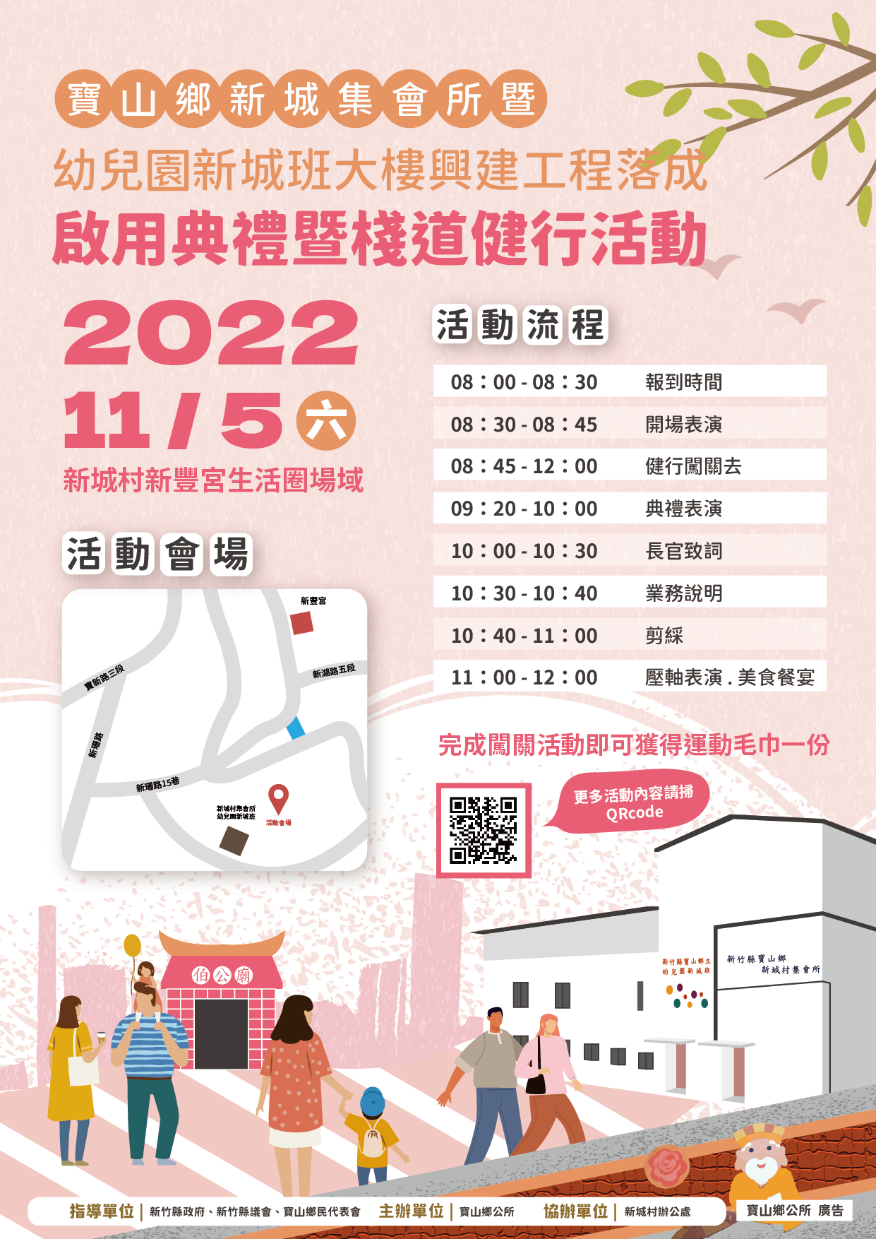 寶山鄉公所於111年11月5日上午8時舉辦「寶山鄉新城集會所暨幼兒園新城班大樓興建工程落成啟用典禮暨棧道健行活動」,於新城村新豐宮生活圈場域熱鬧開場,現場有健行闖關活動、集會所落成典禮以及美食饗宴,邀情民眾「疫」起動動身體、舒展筋骨,透過「健行」來欣賞寶山鄉獨有的絕妙山景,暫時遠離都市喧囂燒腦的快步調,讓芬多精陪您漫步於山林之間,一同享受清晨舒爽的空氣。