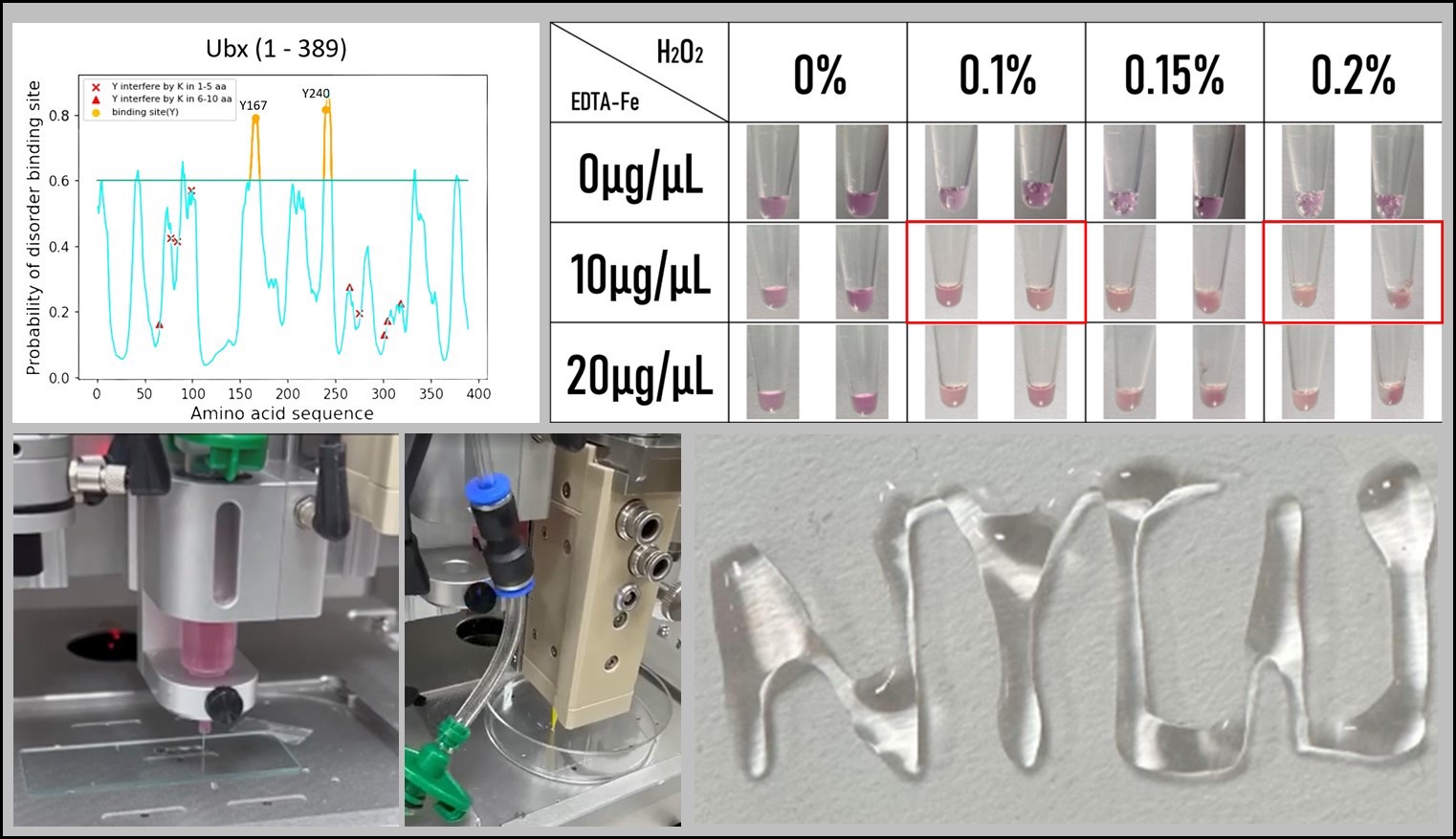 NYCU_Formosa團隊利用資訊工程模擬出具有功能的UBX胜肽,透過實驗驗證UBX融合蛋白具有紅螢光以及自組裝雙重功能,並結合生物3D列印,發揮創意印製出陽明交大校名縮寫NYCU外型的新型生物材料。