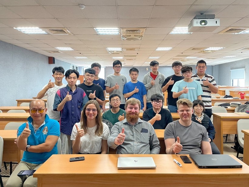 附圖一、清大周卓煇特聘教授(左起)、拉脫維亞學者瑪格麗塔教授、溫布里斯教授、特拉斯科夫斯基斯教授與全體研究生合影。 圖/清大提供