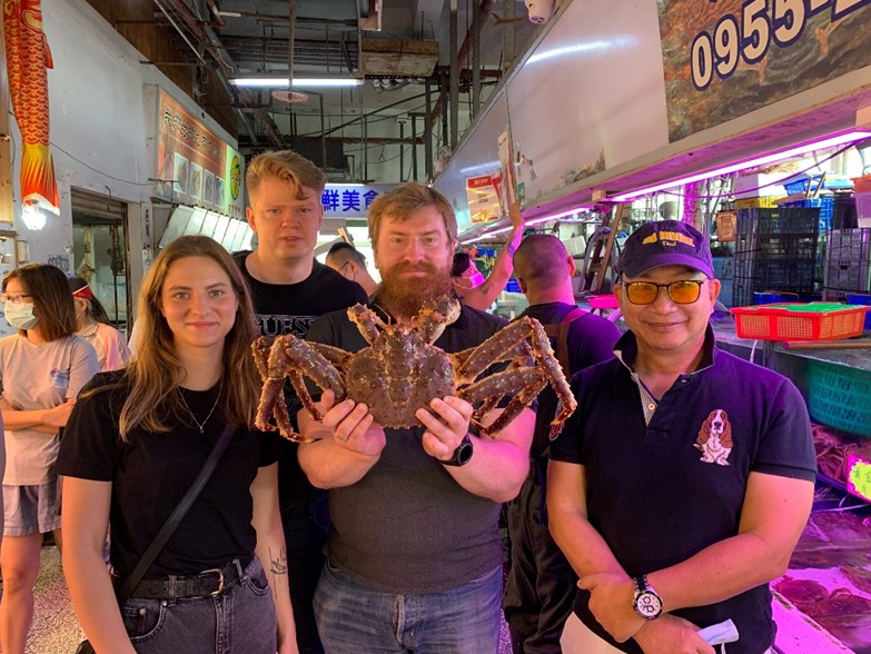 年輕的特拉斯科夫斯基斯,至今沒吃過螃蟹;波羅的海的漁產、海鮮,也是非常有限;周教授與團隊,便在週日,邀請他們一行人,前往南寮漁港,一樓買、二樓煮,從炒海瓜子、螃蟹腳、胡椒鳳螺、糖醋海魚、清蒸石斑、鳳梨蝦球……到日本大蟹,大啖一桌的海鮮(附圖三、四)。