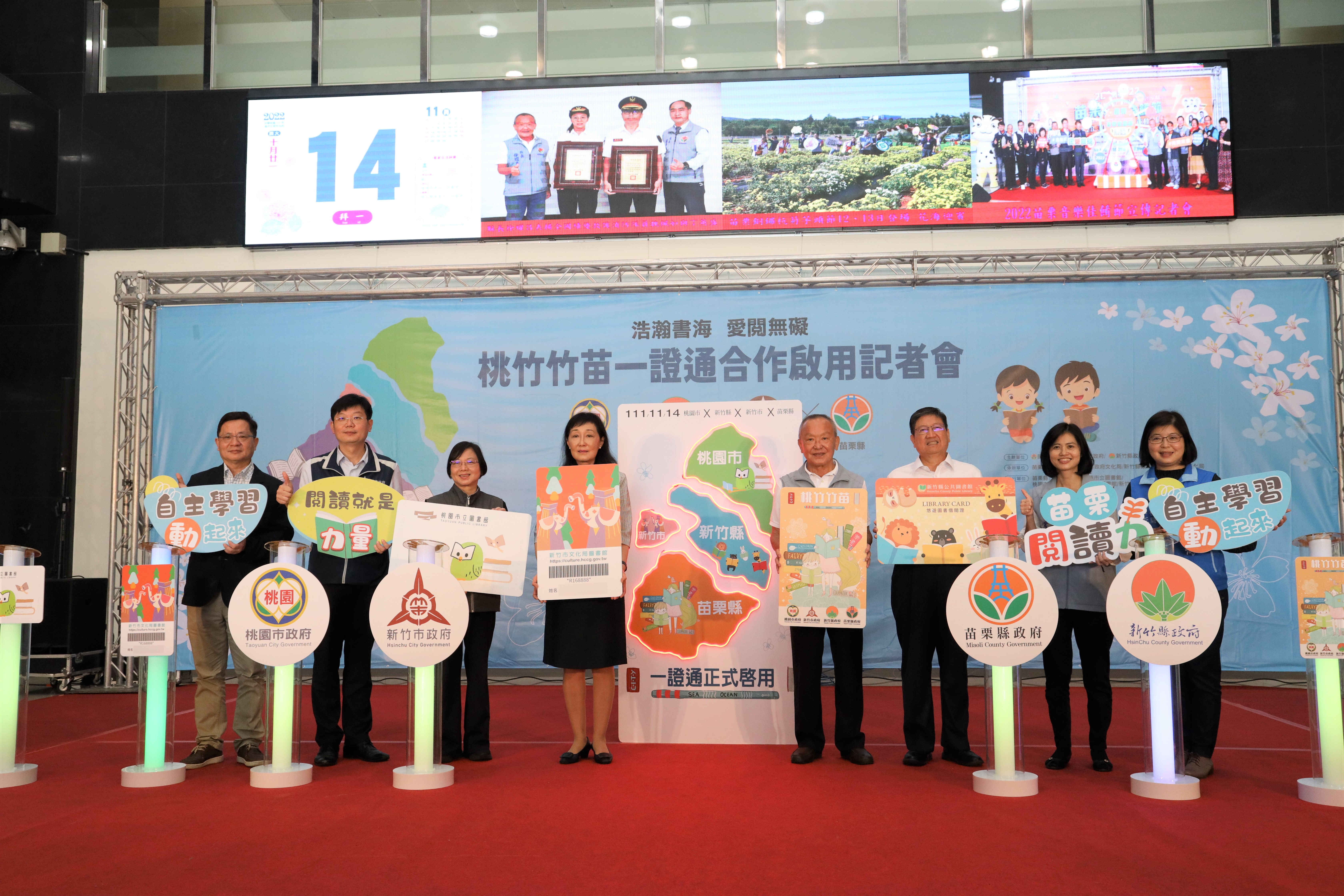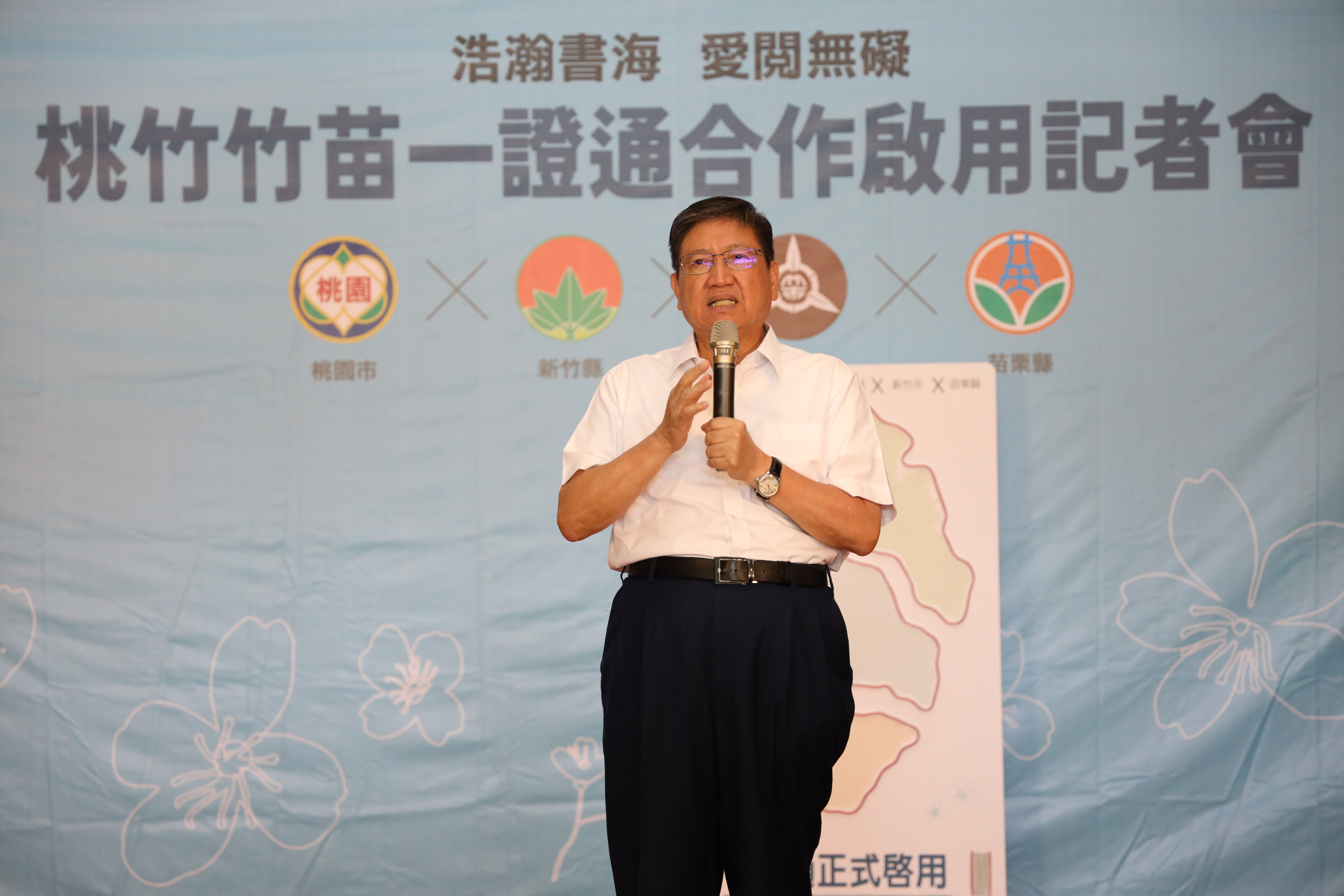 新竹縣長楊文科今上午率縣府文化局長李安妤,出席在苗栗縣政府舉辦的「桃竹竹苗一證通合作啟用記者會」,和苗栗縣長徐耀昌、新竹市副市長李世珍、桃園市政府文化局長莊秀美等縣市代表同台與會。