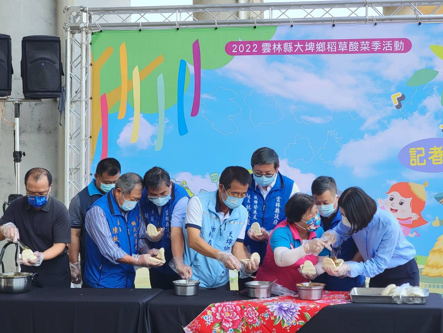 雲林縣大埤鄉公所將於12月17日至18日週六、日兩天在大埤鄉稻草藝術園區舉辦《2022雲林縣大埤鄉稻草酸菜季活動~藝起稻大『埤』嗨埤GO》活動宣傳記者會,今日(11月18日)在活動會場預定地舉行活動宣傳會,有大埤鄉林森寶鄉長、雲林縣政府林孟儀參議、文化觀光處陳璧君處長、城鄉發展處林長造處長、社會處林文志處長、大埤鄉民代表會陳秋慶主席、三結村長徐萬成、三結社區黃迺勛理事長共同與會出席,宣傳記者會搶先讓大家一睹各項大型稻草意象創作的成果,並由豐田社區曾鳳珠理事長指導與會貴賓製作刈包並加入大埤酸菜增加美味。