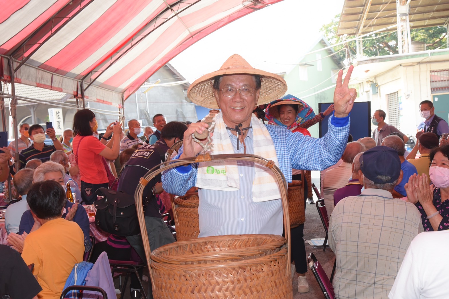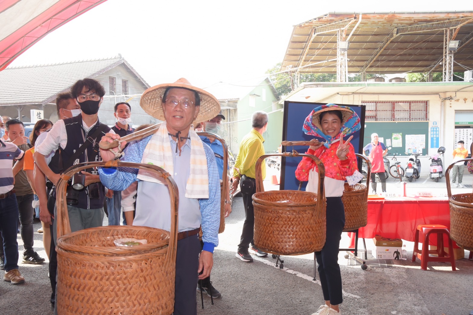為帶動氣氛,縣長林明溱、立委許淑華、草屯鎮長簡景賢擔著「割稻飯」進場,全場為之注目。林明溱及許淑華表示,以前農民互相割稻,沒有酬勞,但吃一頓飯表示謝意,這是割稻飯的來由,也代表農村社會濃厚人情及互助精神,草屯鎮農會這項活動非常有意義。