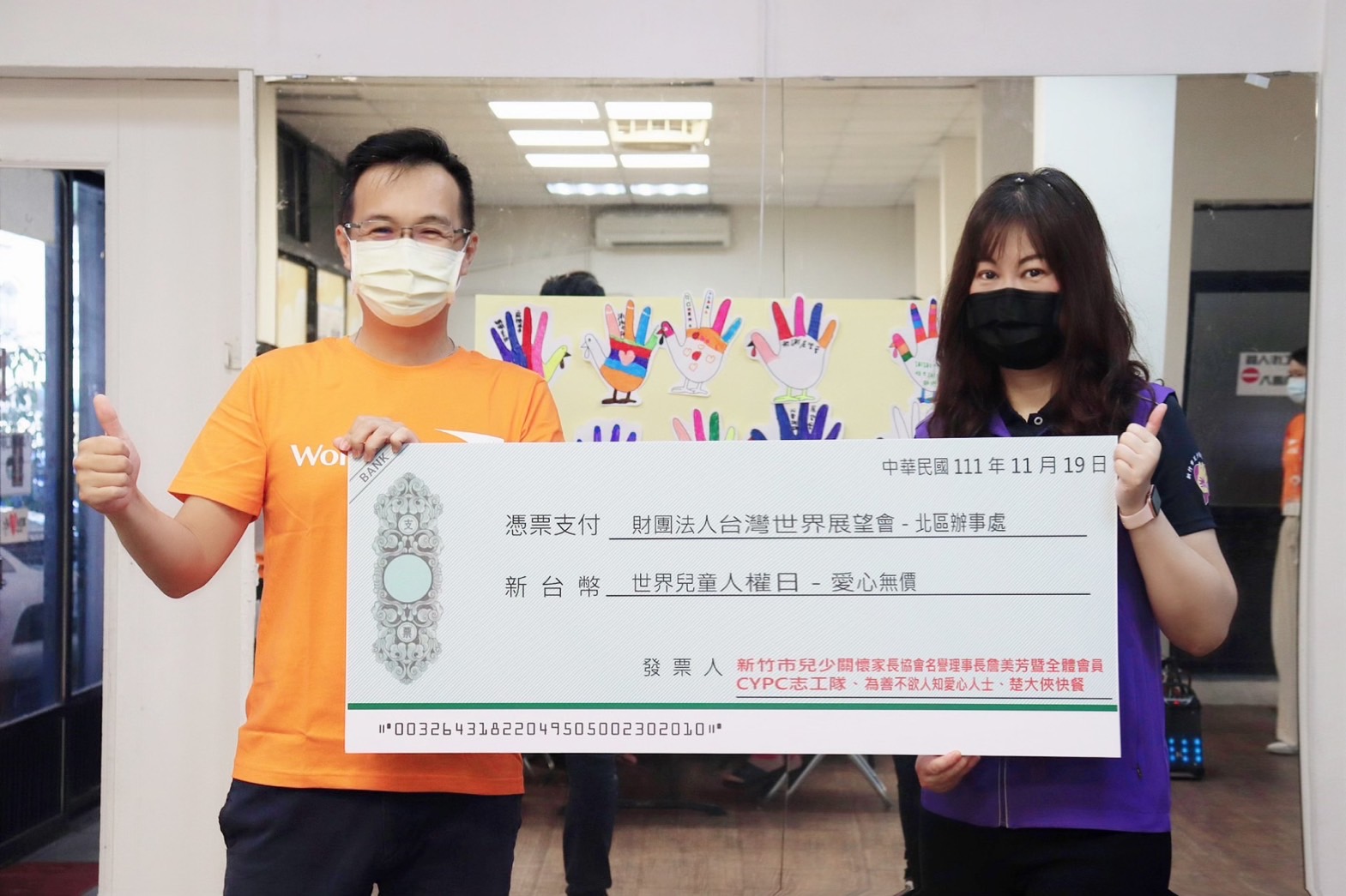 新竹市兒少關懷家長協會名譽理事長詹美芳表示:「攝取充足的營養是孩子成長過程不可缺少的,期許我們能繼續散播愛,並用生命影響生命。」她特別在世界兒童人權日與感恩節前,由名譽理事長詹美芳號召鄭國隆理事長、協會會員、CYCP志工隊夥伴,與為善不欲人知的愛心人士,並結合楚大俠快餐,以實際行動倡議兒童權利的重要性,也期盼自己的行動能觸及更多親友、協會或企業,鼓勵大家接棒愛心,響應台灣世界展望會關懷行動。