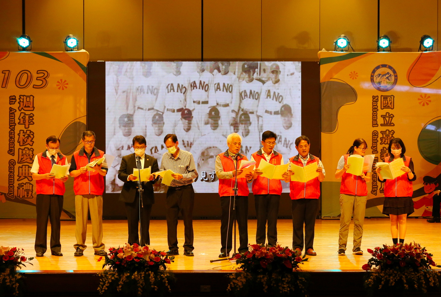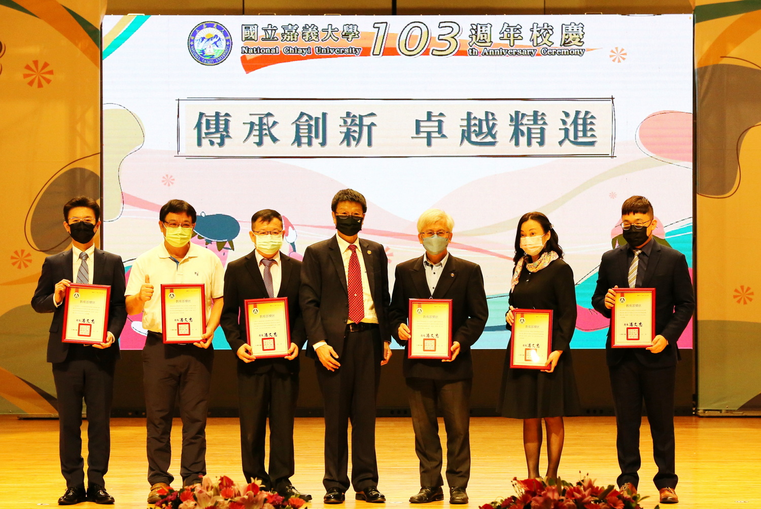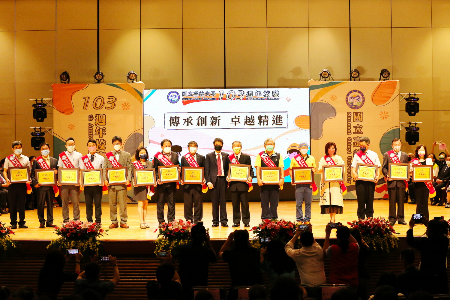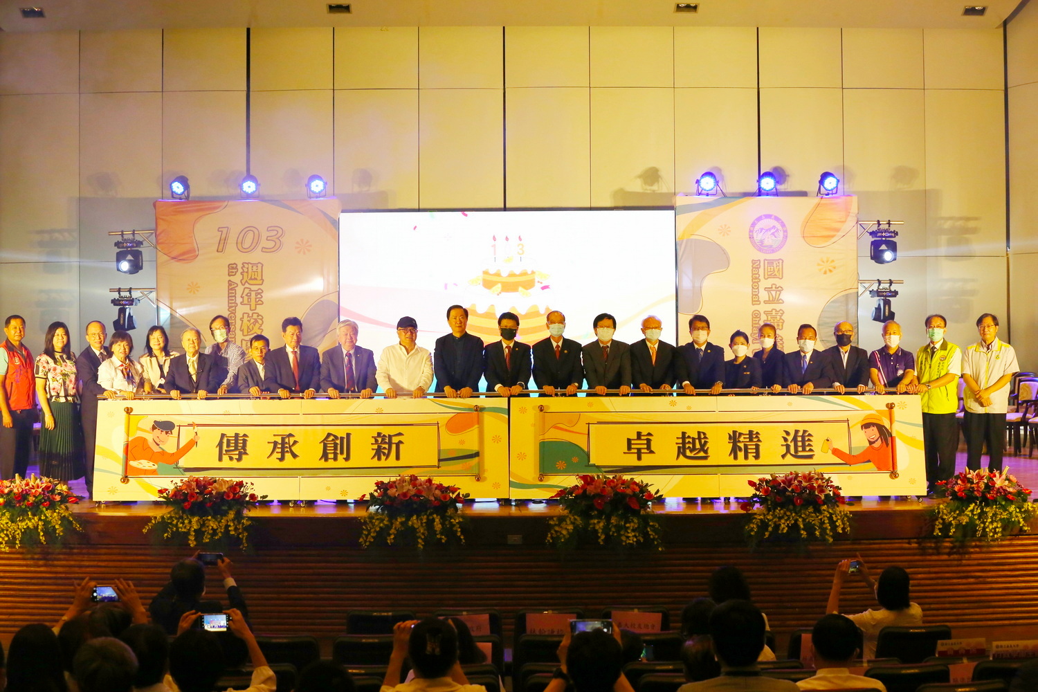 典禮最後,林翰謙校長與歷任校長及貴賓啟動校慶主題「傳承創新 卓越精進」電動卷軸及LED電子螢幕,呈現生日快樂動畫,並在全場歡呼嘉義大學生日快樂聲中,將103週年校慶典禮帶至最高潮。