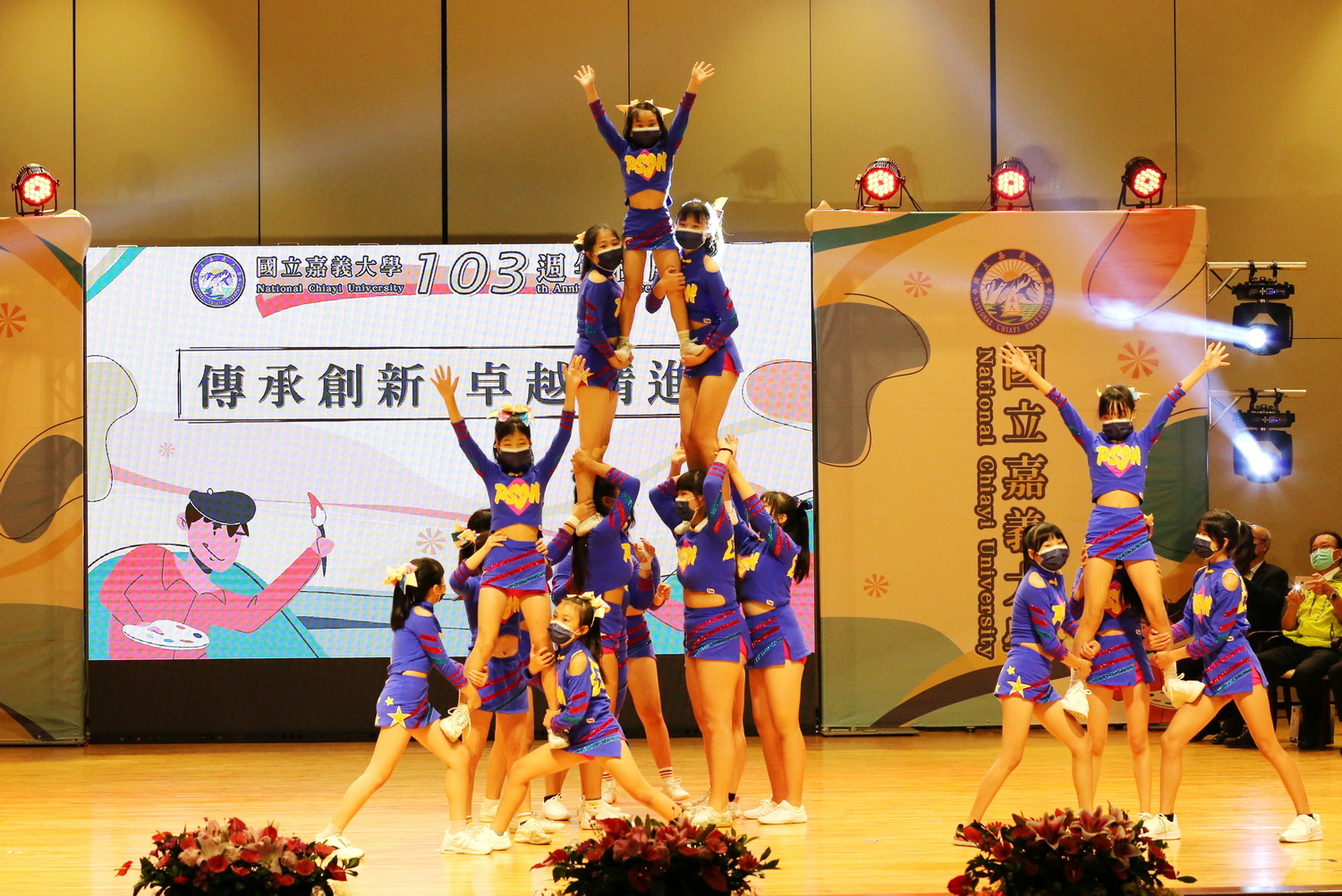 嘉義大學11月19日在蘭潭校區瑞穗館舉行103週校慶典禮,典禮由嘉大音樂學系爵士樂團精采的樂曲揭開序幕,並有太陽競技啦啦隊展現平日練習的成果為嘉大慶生,來自臺北市國立嘉義大學校友會校友們獻唱改制前的校歌,現今校歌則由嘉大蘭潭國樂團領唱,彰顯嘉大悠久歷史及優良傳承。