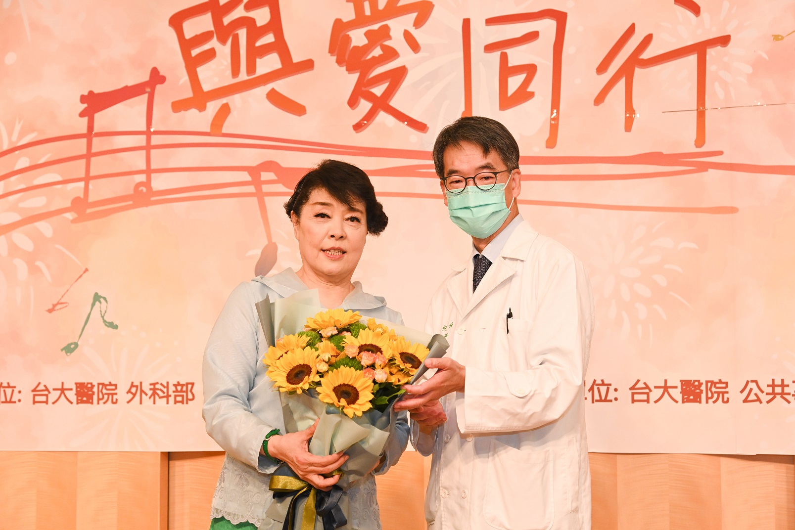 感謝器官捐贈者大愛 臺大醫院舉辦愛同行感恩音樂會-外科部黃俊升主任獻花予聲樂家簡文秀教授 圖/臺大醫院提供