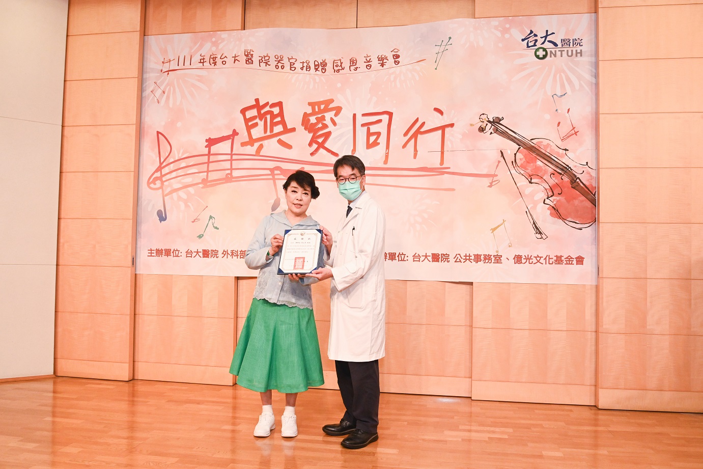感謝器官捐贈者大愛 臺大醫院舉辦愛同行感恩音樂會-外科部黃俊升主任致贈感謝狀予聲樂家簡文秀教授