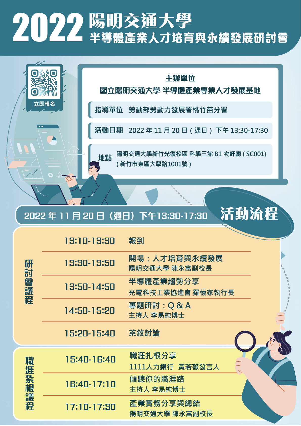 半導體產業專業人才發展基地於今(20)日舉辦「半導體產業人才培育與永續發展研討會」,邀請1111人力銀行黃若薇發言人分享從自我探索開始,藉由自我檢視瞭解興趣後結合專業職能與產業發展趨勢,建構完整職涯發展目標。光電科技工業協進會羅懷家執行長也分享目前半導體產業趨勢,介紹無線通訊、車用領域應用、物聯網等半導體產業未來三大重要發展方向。