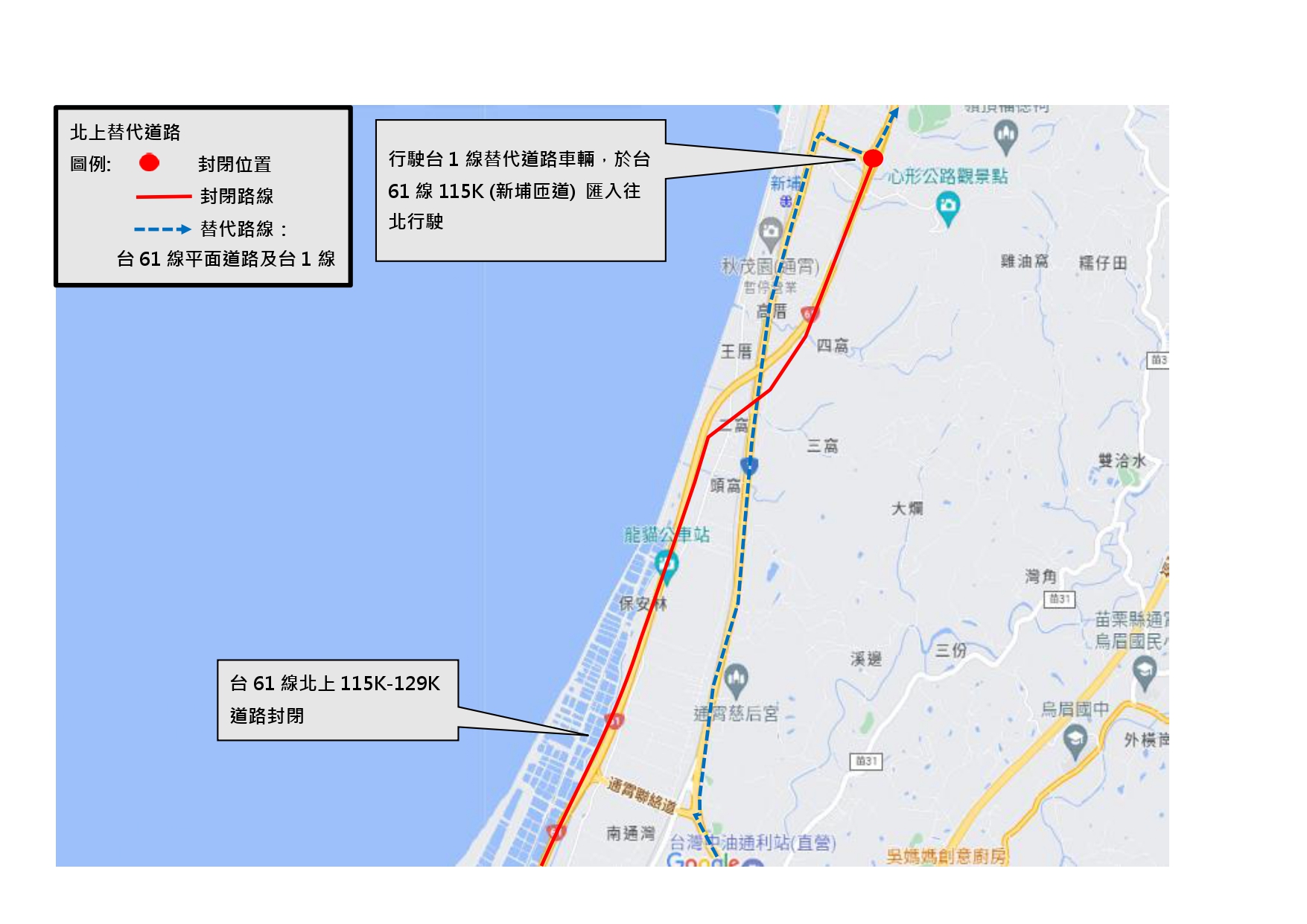 北上封閉台61線134K+600(大甲匝道)至115K (新埔匝道)路段主線車道,原行駛於該路段之北上車輛於台61線134K+600(大甲匝道)匯出,行駛平面道路或台1線,至台61線115K (新埔匝道)北上入口匝道再匯入主線往北行駛。