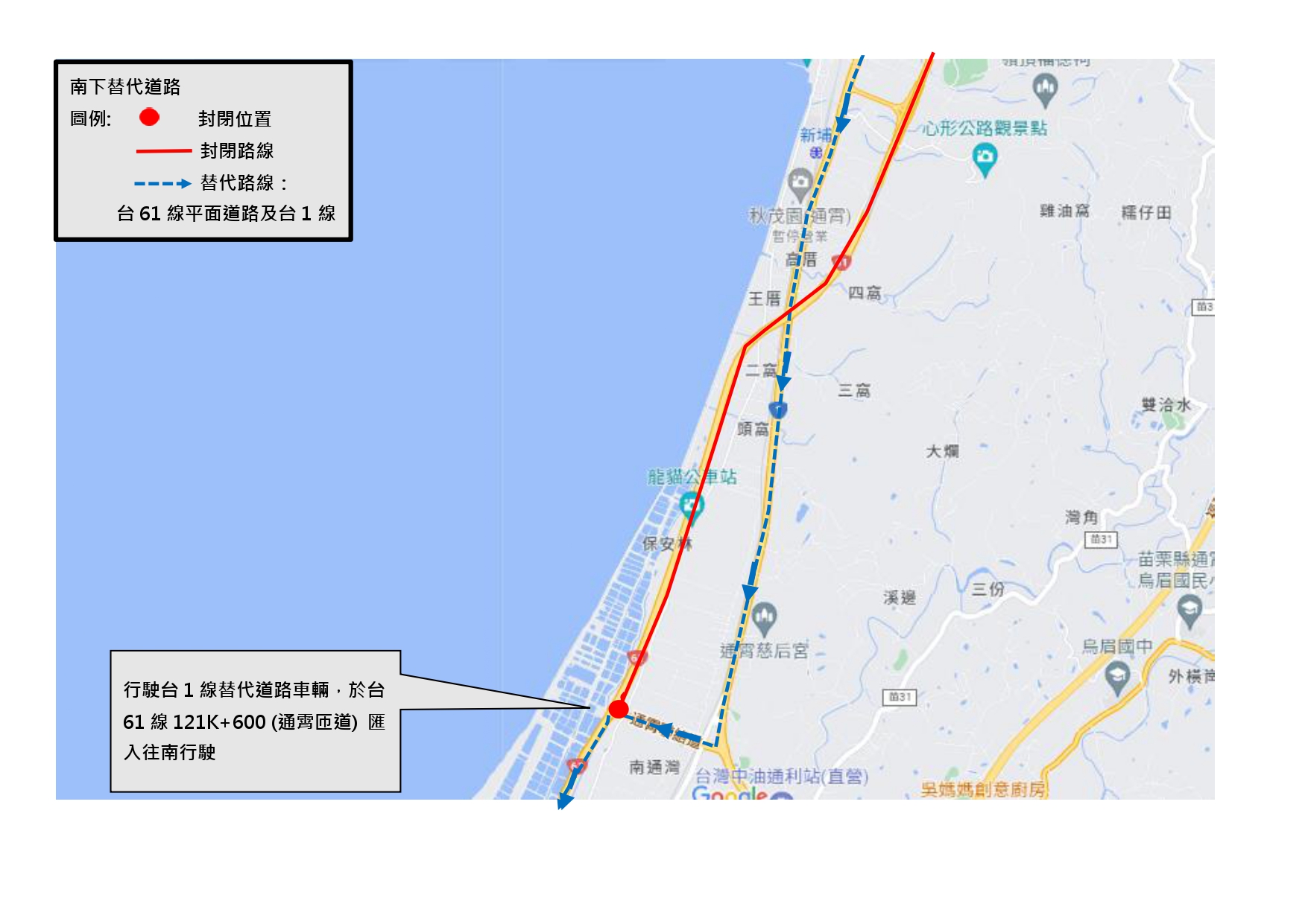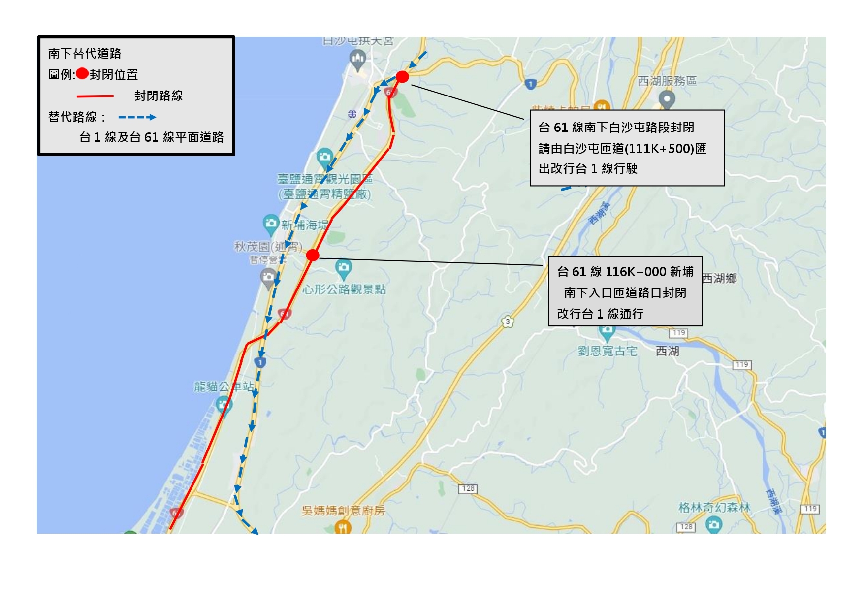 南下封閉台61線111K+500(白沙屯匝道)至121K+600(通霄匝道)路段主線車道,原行駛於該路段之南下車輛,於台61線111K+500 (白沙屯匝道)匯出,行駛平面道路或台1線,至台61線121K+600(通霄匝道)南下入口匝道再匯入主線往南行駛。